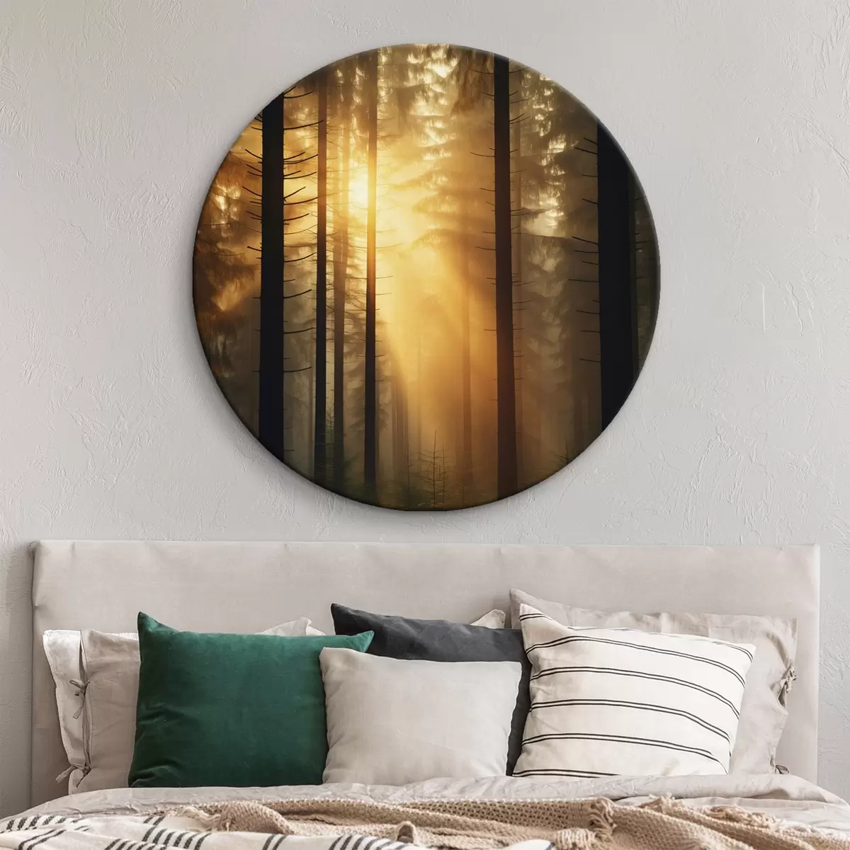 Tableaux rondes Forêt de pins dense avec la lumière du coucher de soleil, réalisme, nature Nr r44615