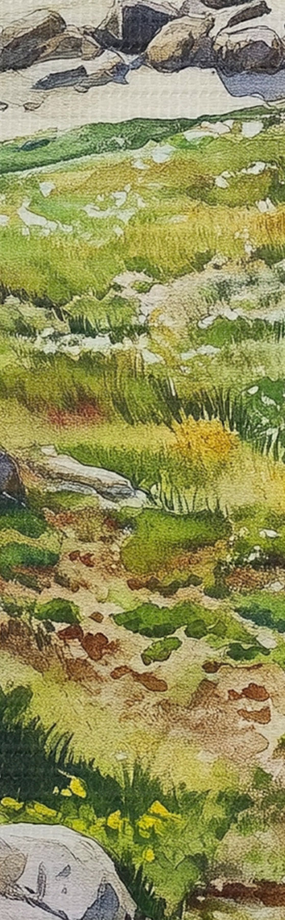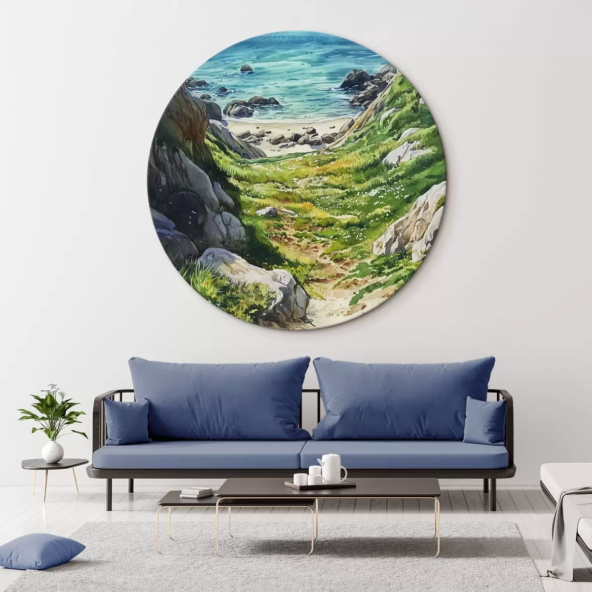 Tableaux rondes Côte maritime avec des rochers et de l'herbe verte, style aquarelle, été r44616