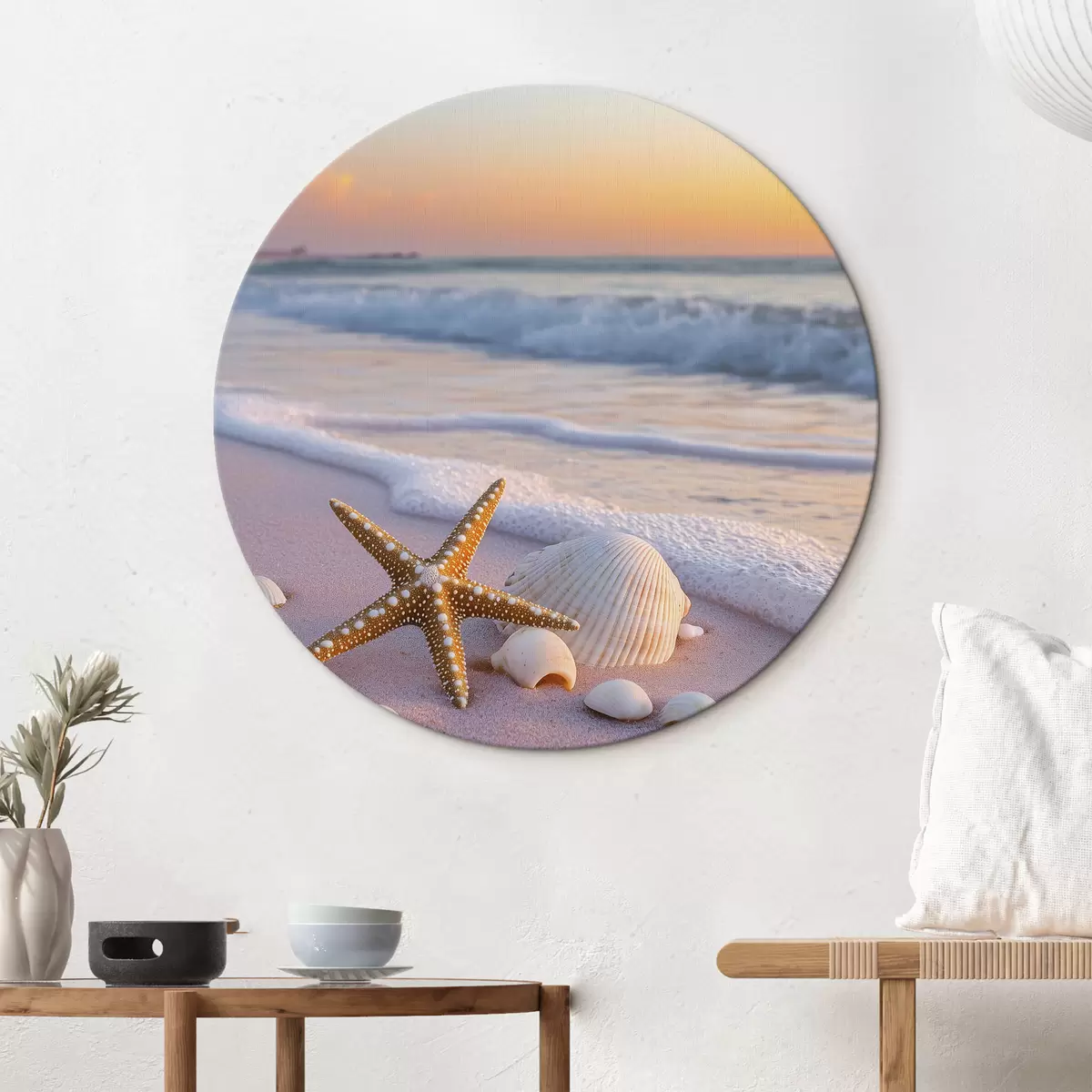 Tableaux rondes Côte maritime avec étoiles de mer, coquillages et vagues Nr r44714