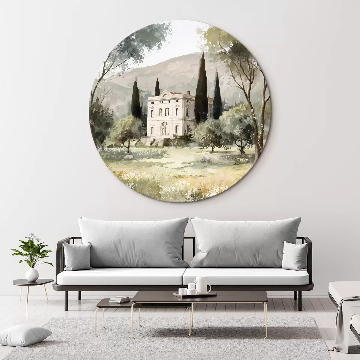 Tableaux rondes Village méditerranéen avec maison blanche entourée de jardin r44796