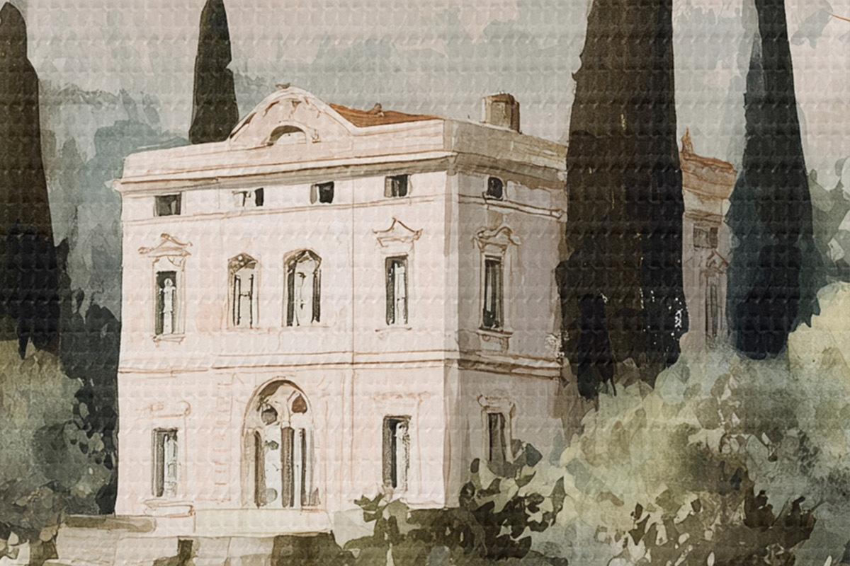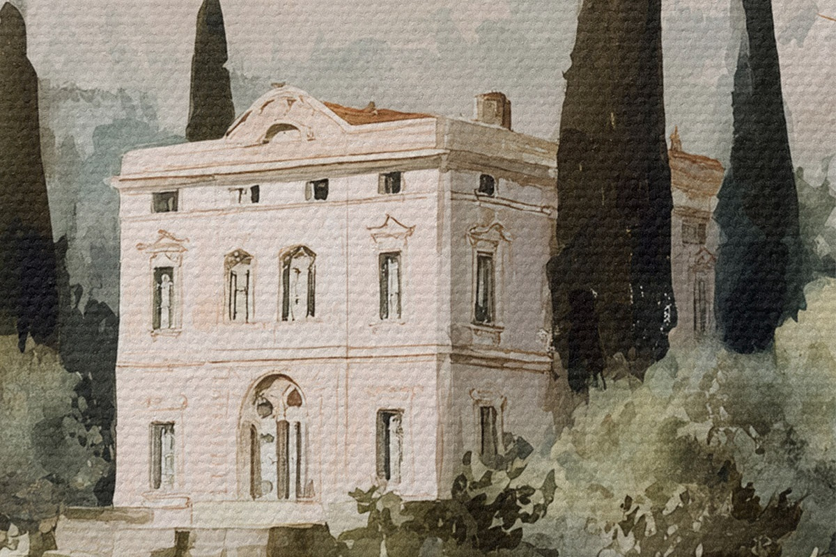 Tableaux rondes Village méditerranéen avec maison blanche entourée de jardin Nr r44796