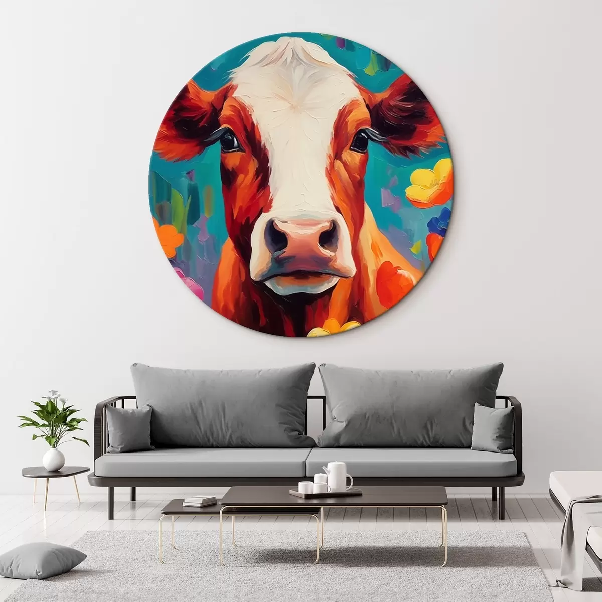 Tableaux rondes Vache parmi les fleurs r44803