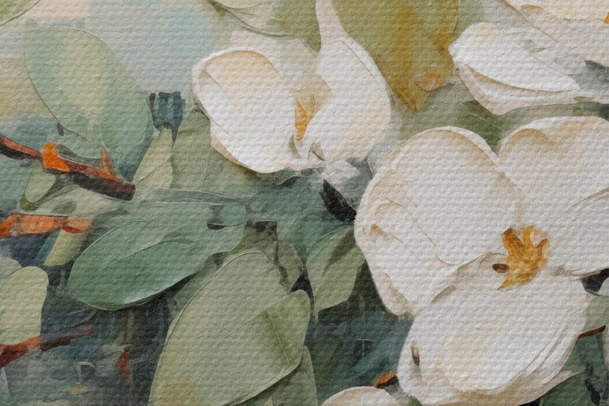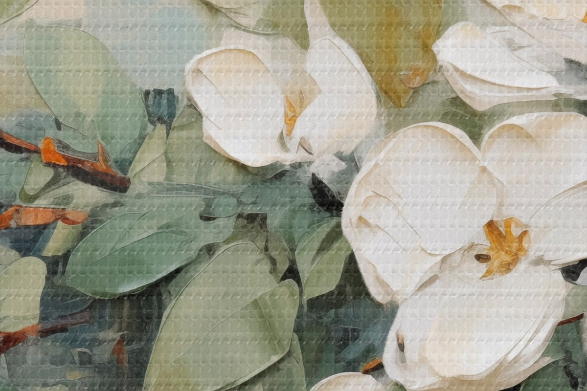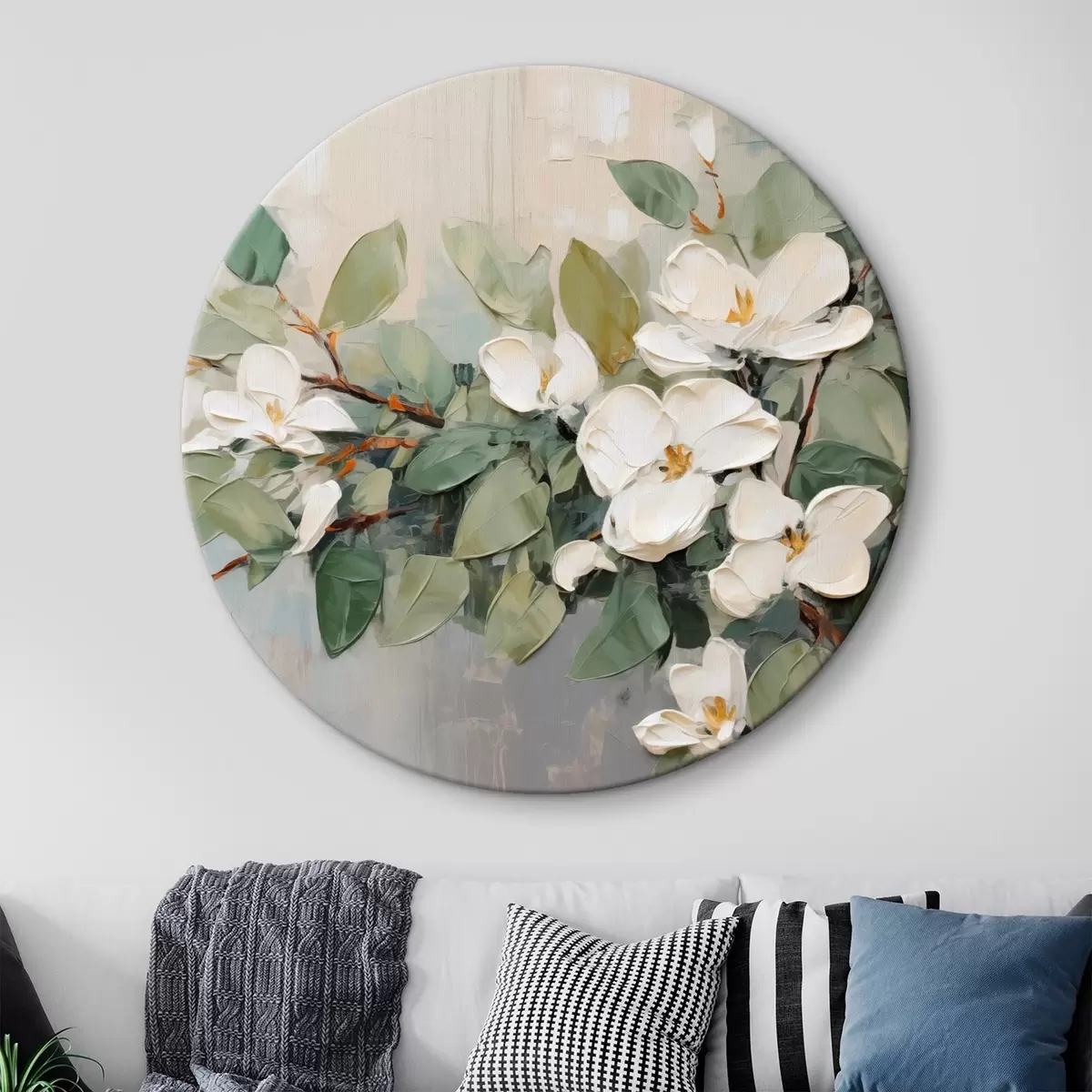 Tableaux rondes Fleurs de magnolia avec feuilles vertes sur une branche, style texturé par empâtement, palette de couleurs douces r44853