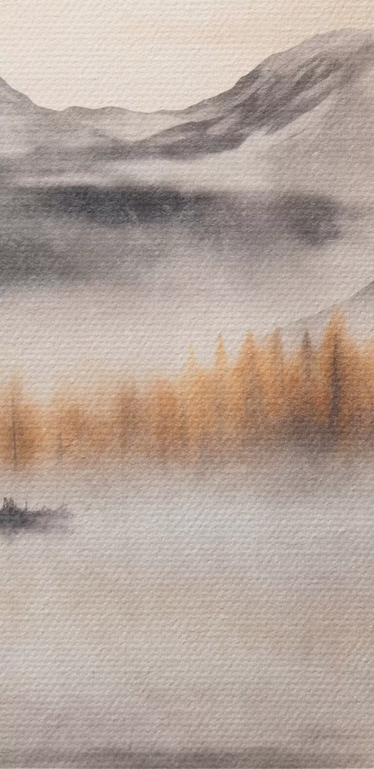 Tableaux rondes Paysage de lac brumeux et texturé avec des pins et des montagnes, ciel gris nuageux r44856