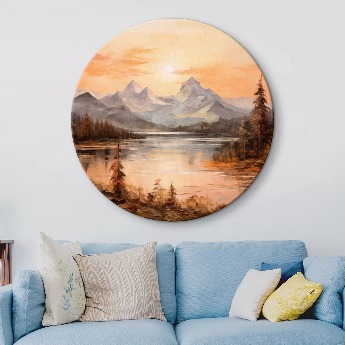 Tableaux rondes Paysage avec un lac entouré d'arbres et de montagnes en arrière-plan, ciel orange avec le soleil Nr r44857
