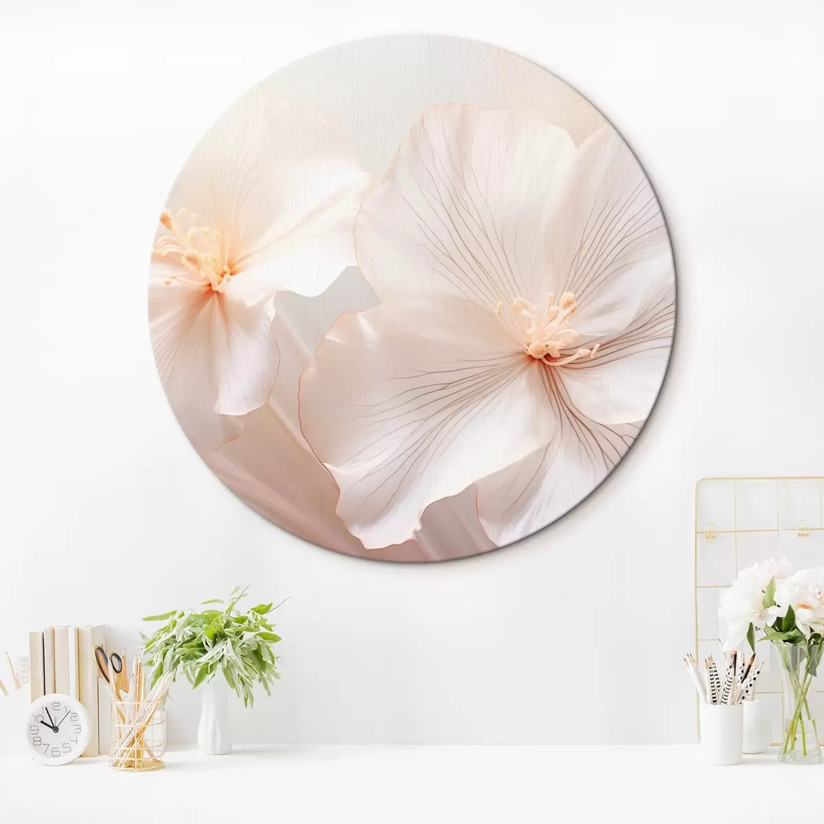 Tableaux rondes Fleurs blanches délicates avec des pétales et des centres aux couleurs douces et pastel, créant un art floral éthéré et rêveur Nr r44858