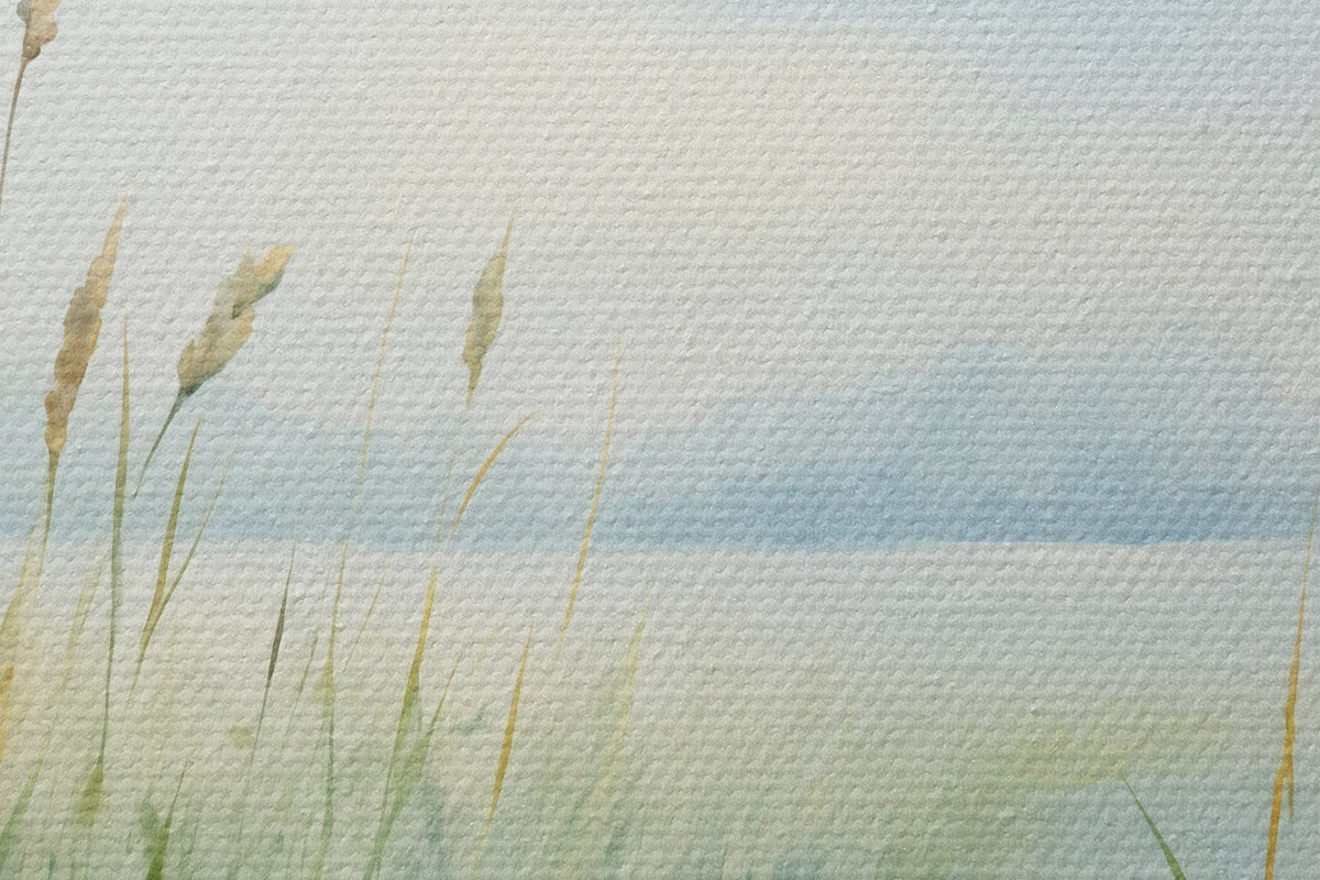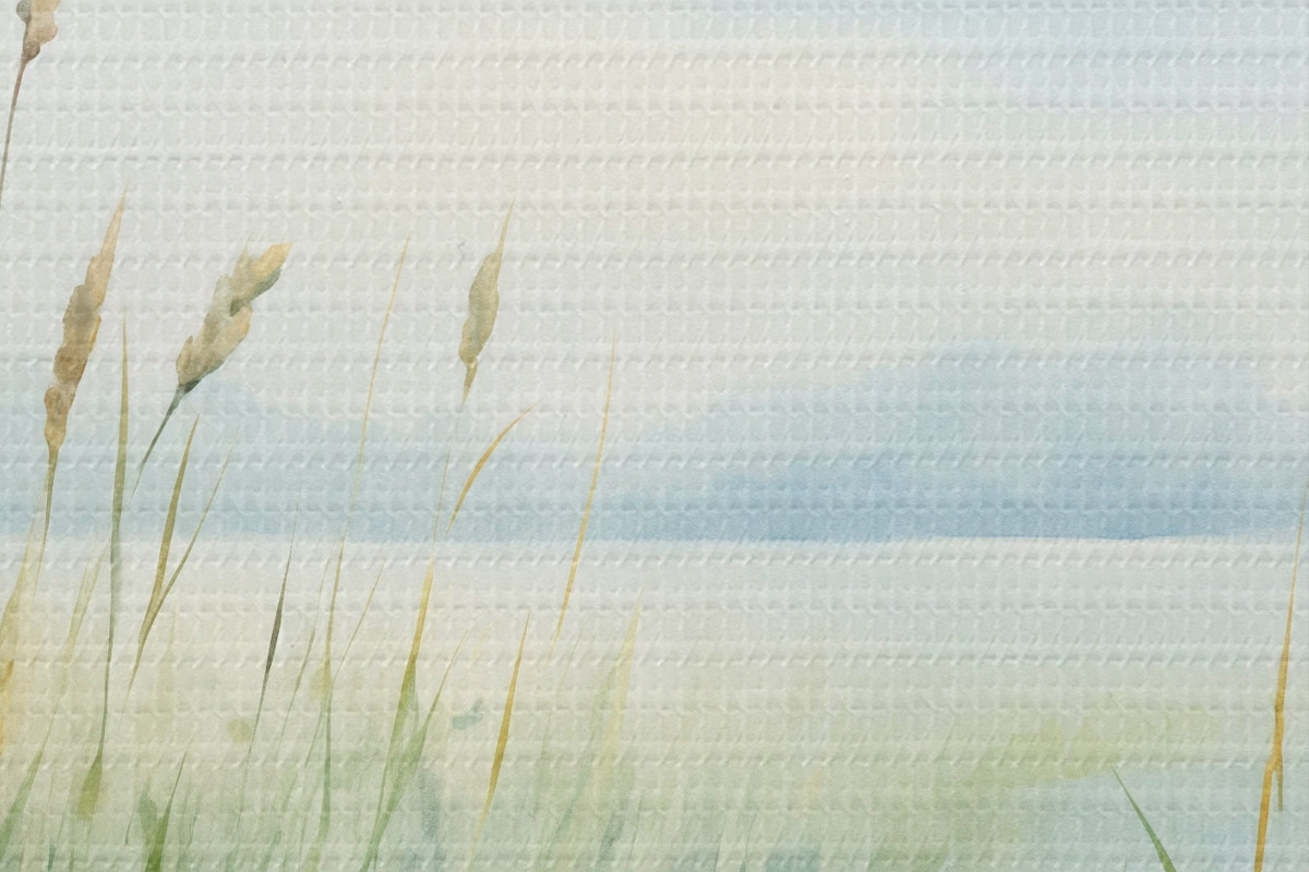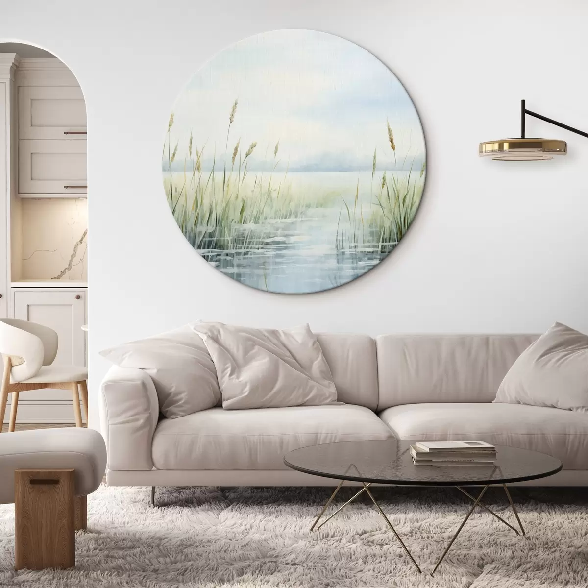 Tableaux rondes Une peinture à l'aquarelle imitant les hautes herbes poussant près de l'eau, un ciel couvert et un arrière-plan flou Nr r44860