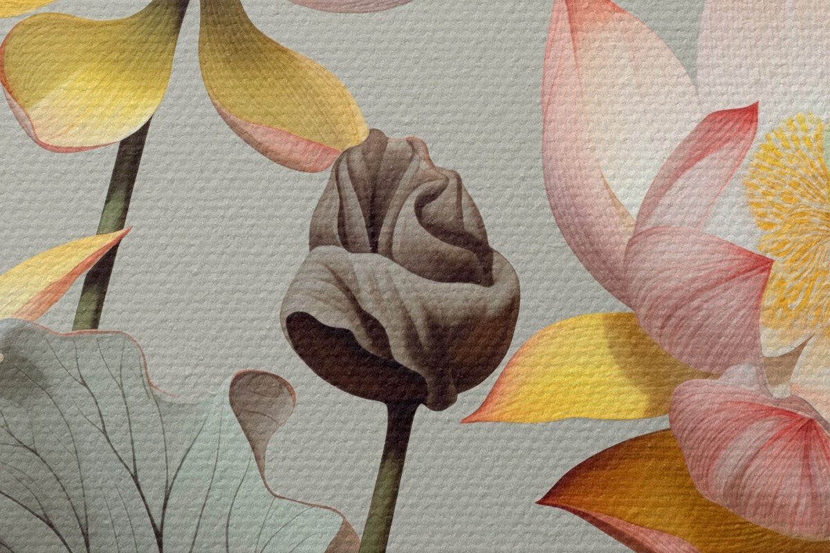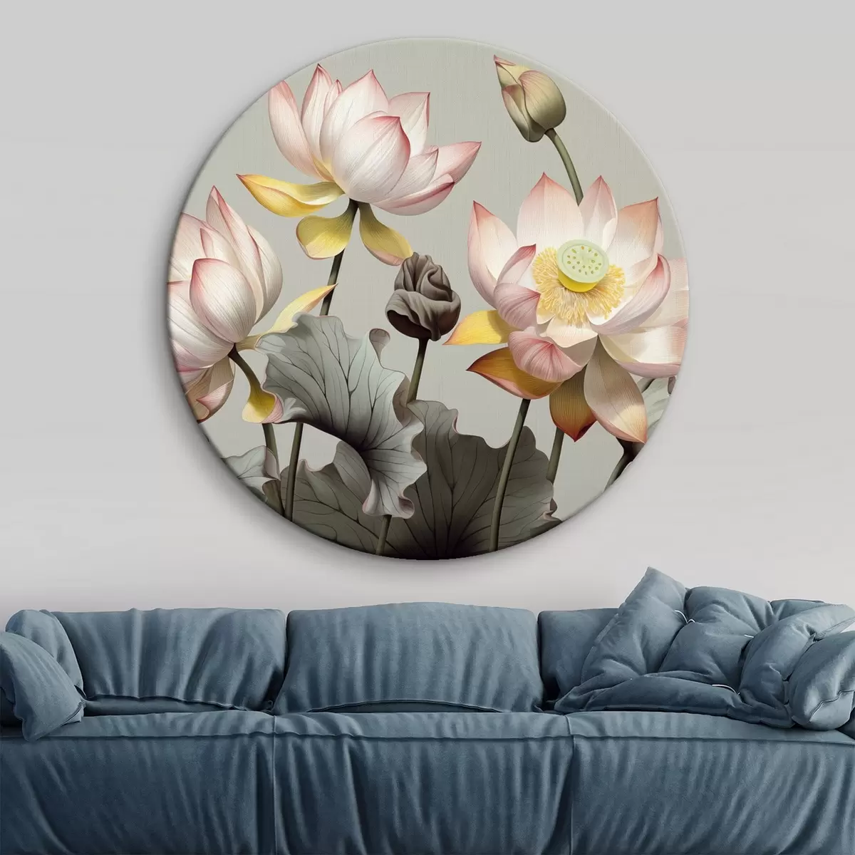 Tableaux rondes Fleurs de lotus aux pétales pastel et aux feuilles vertes, dans une palette de couleurs sourdes, sur un fond uni Nr r44862