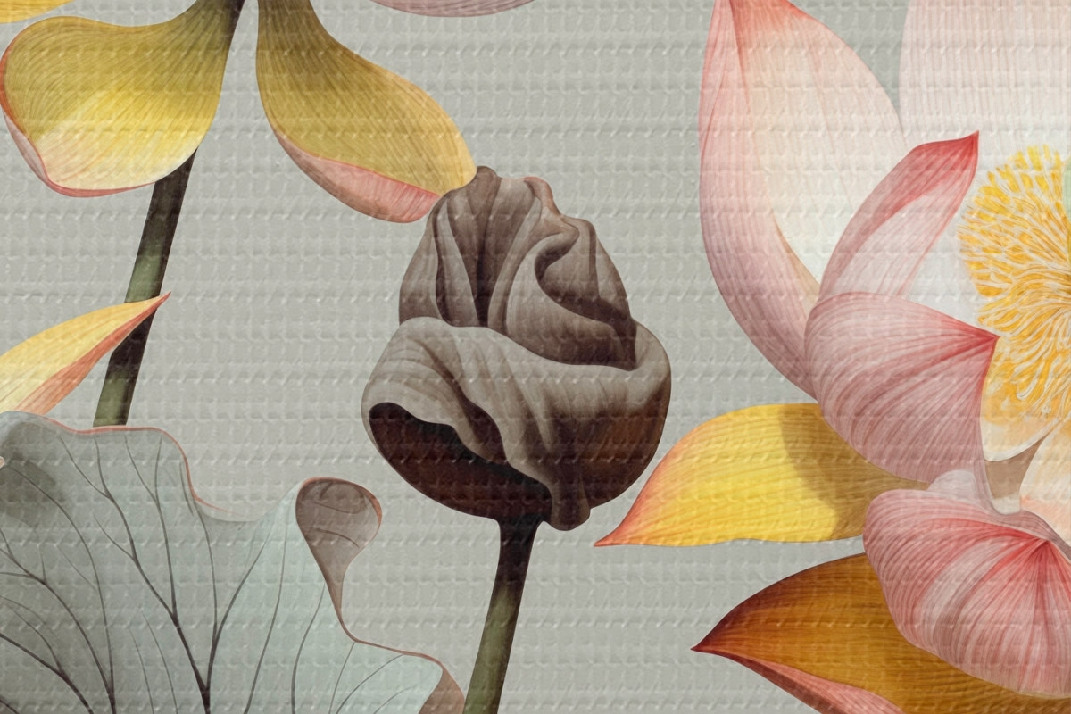 Tableaux rondes Fleurs de lotus aux pétales pastel et aux feuilles vertes, dans une palette de couleurs sourdes, sur un fond uni r44862