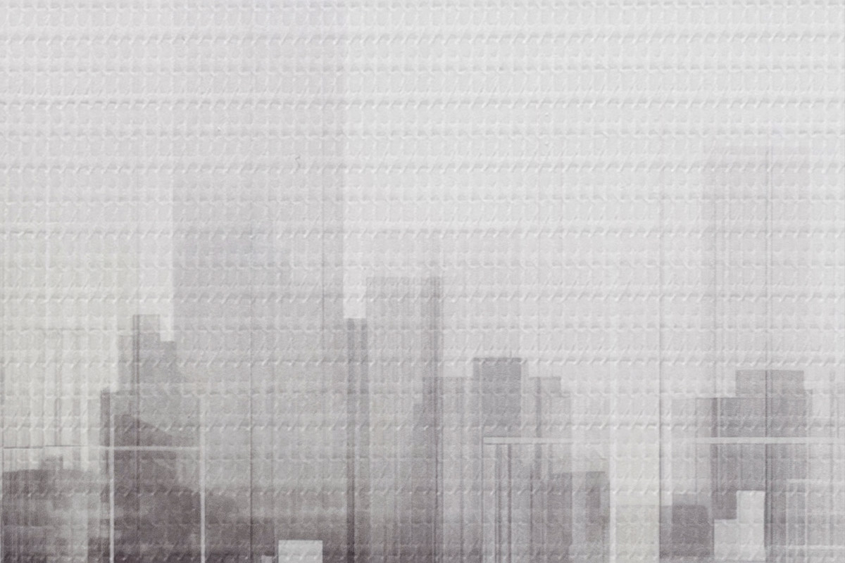 Tableaux rondes Paysage urbain minimaliste texturé avec de grands bâtiments et des gratte-ciel, silhouettés sur un ciel blanc Nr r44863