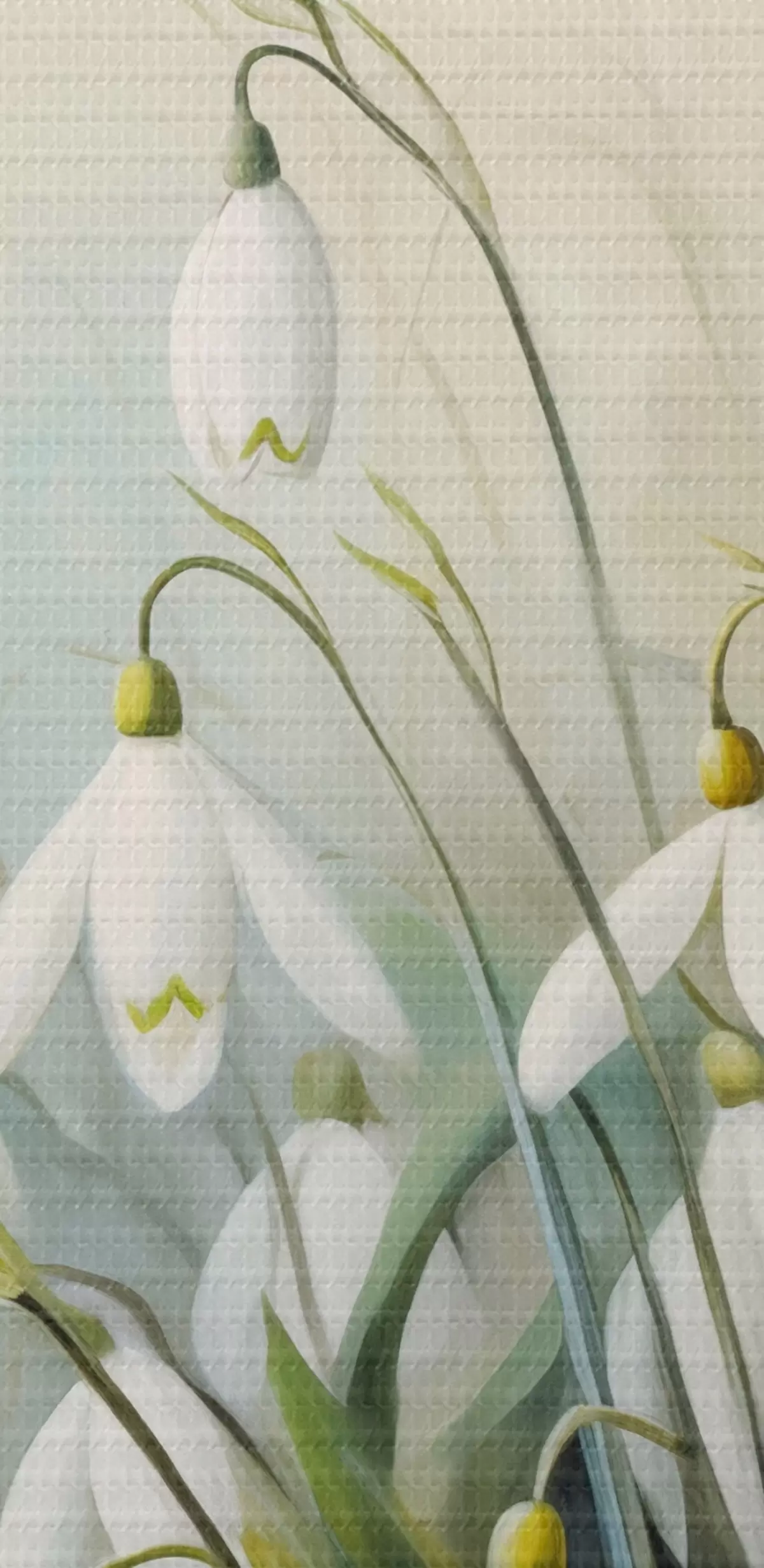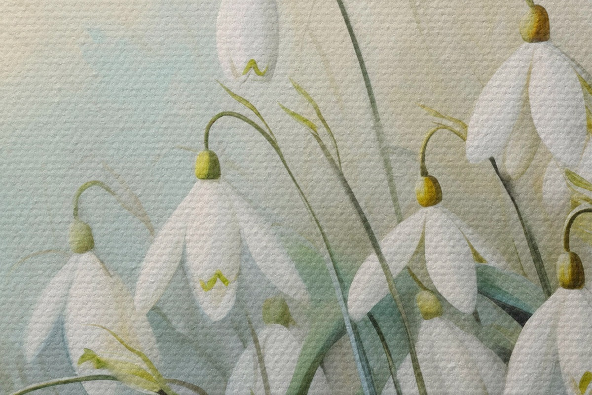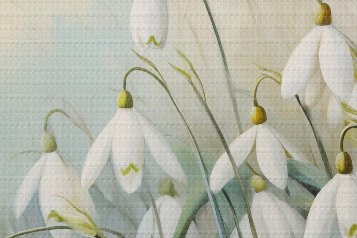 Tableaux rondes Fleurs blanches de perce-neige avec des tiges et des feuilles bleues et vertes, coups de pinceau doux, arrière-plan flou Nr r44864