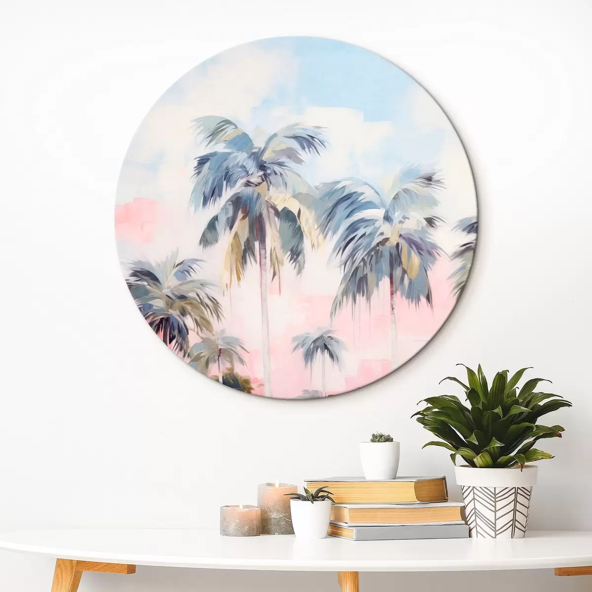 Tableaux rondes Palmiers aux feuilles pastel et aux troncs bruns, ciel rose et bleu, environnement tropical r44866