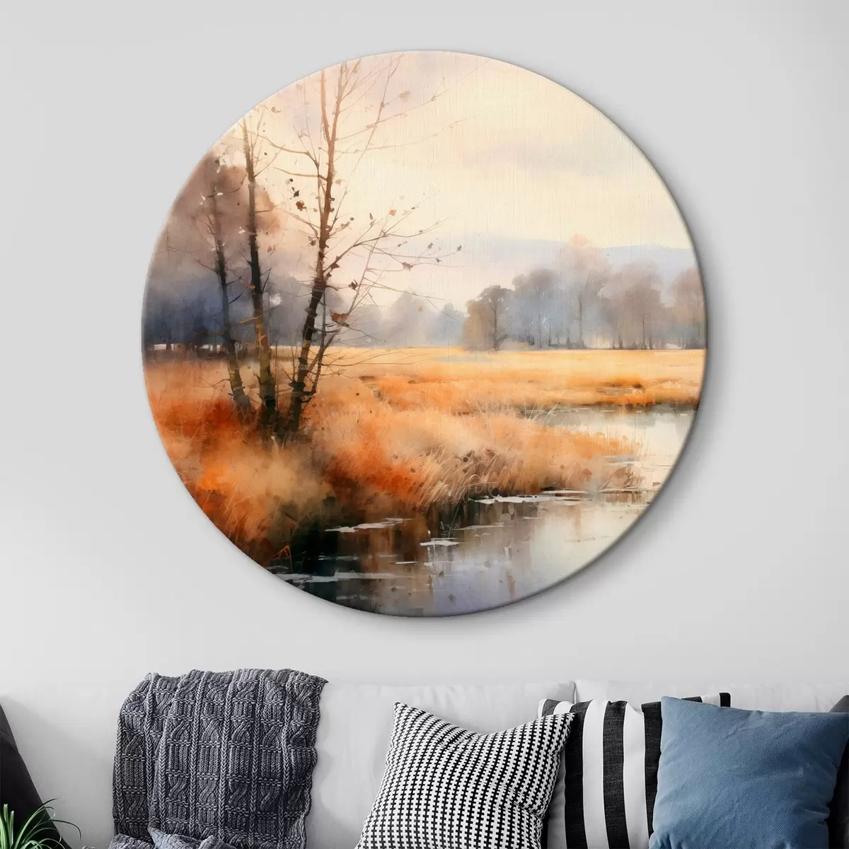 Tableaux rondes Une peinture de paysage tranquille et texturée imitant les roseaux et les arbres dénudés, l'eau calme sous un ciel.. Nr r44867