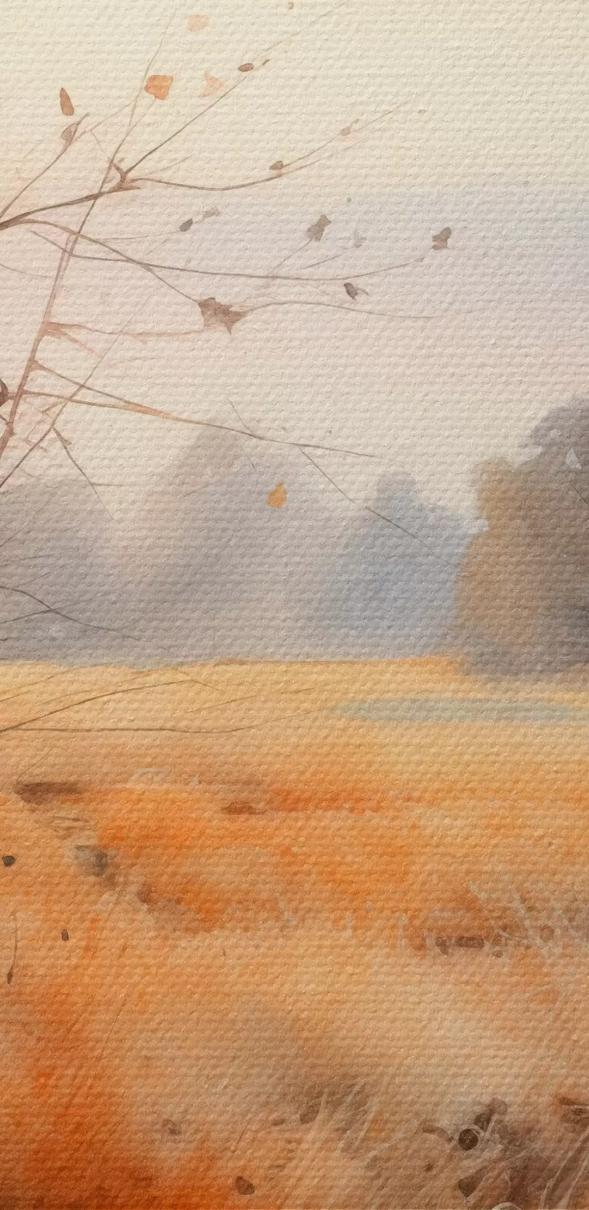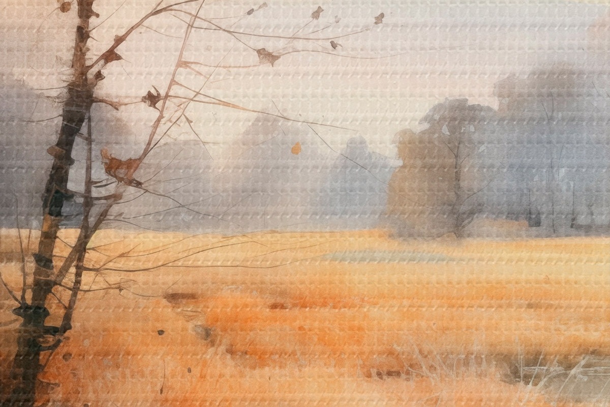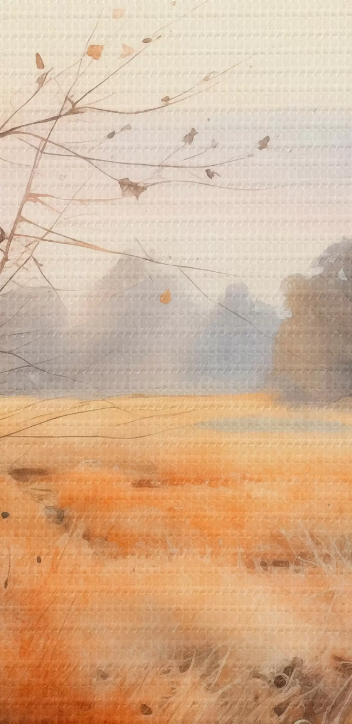 Tableaux rondes Une peinture de paysage tranquille et texturée imitant les roseaux et les arbres dénudés, l'eau calme sous un ciel.. r44867
