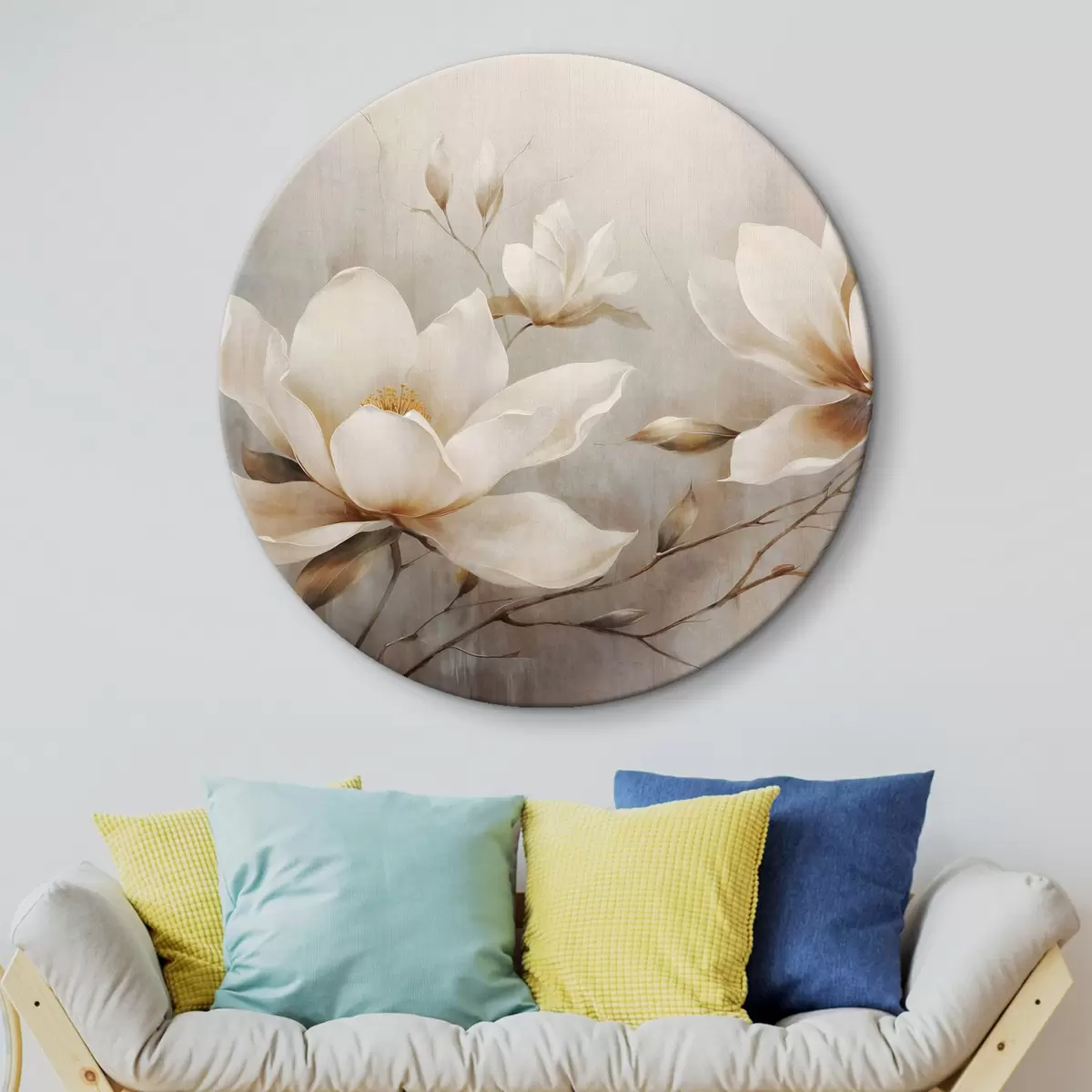 Tableaux rondes Fleurs de magnolia blanches texturées sur des branches sur un fond marron clair Nr r44869