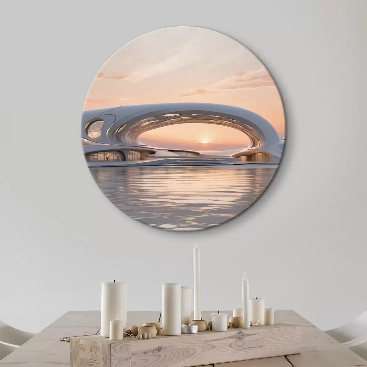Tableaux rondes Bâtiment futuriste sur l'eau sur fond de coucher de soleil rose Nr r44884