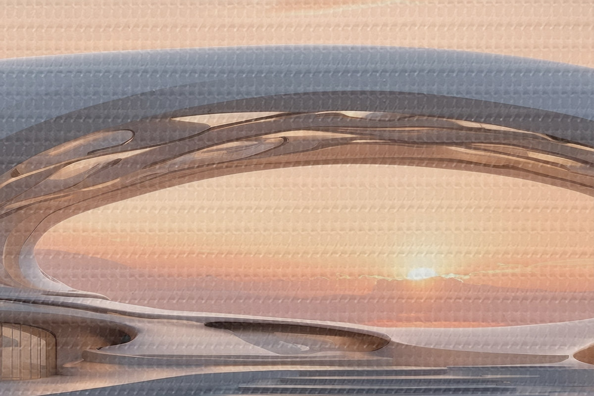 Tableaux rondes Bâtiment futuriste sur l'eau sur fond de coucher de soleil rose r44884