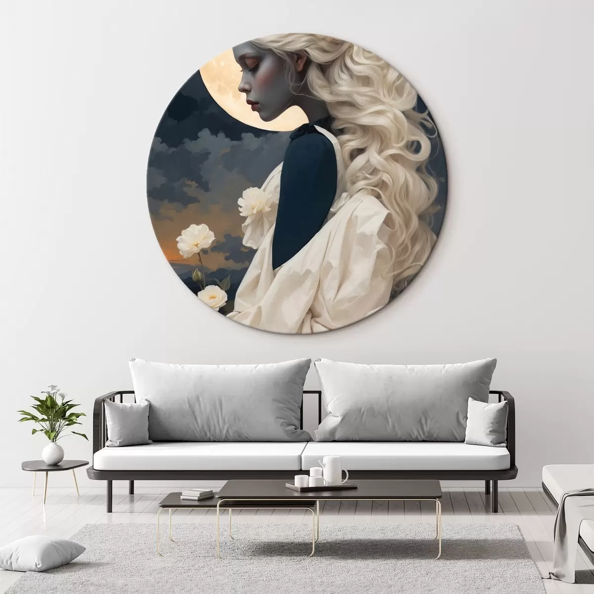 Tableaux rondes Portrait d'une jeune fille aux cheveux blancs et à la pleine lune Nr r44887