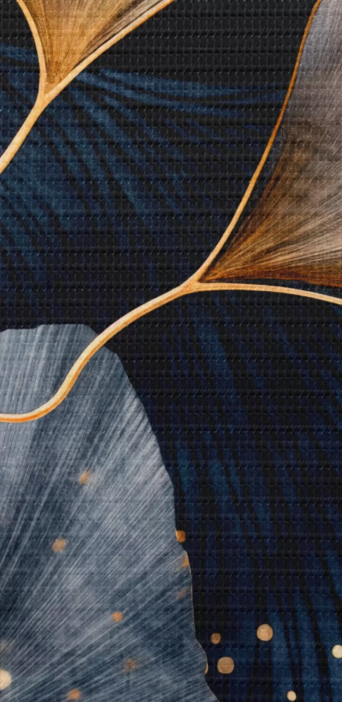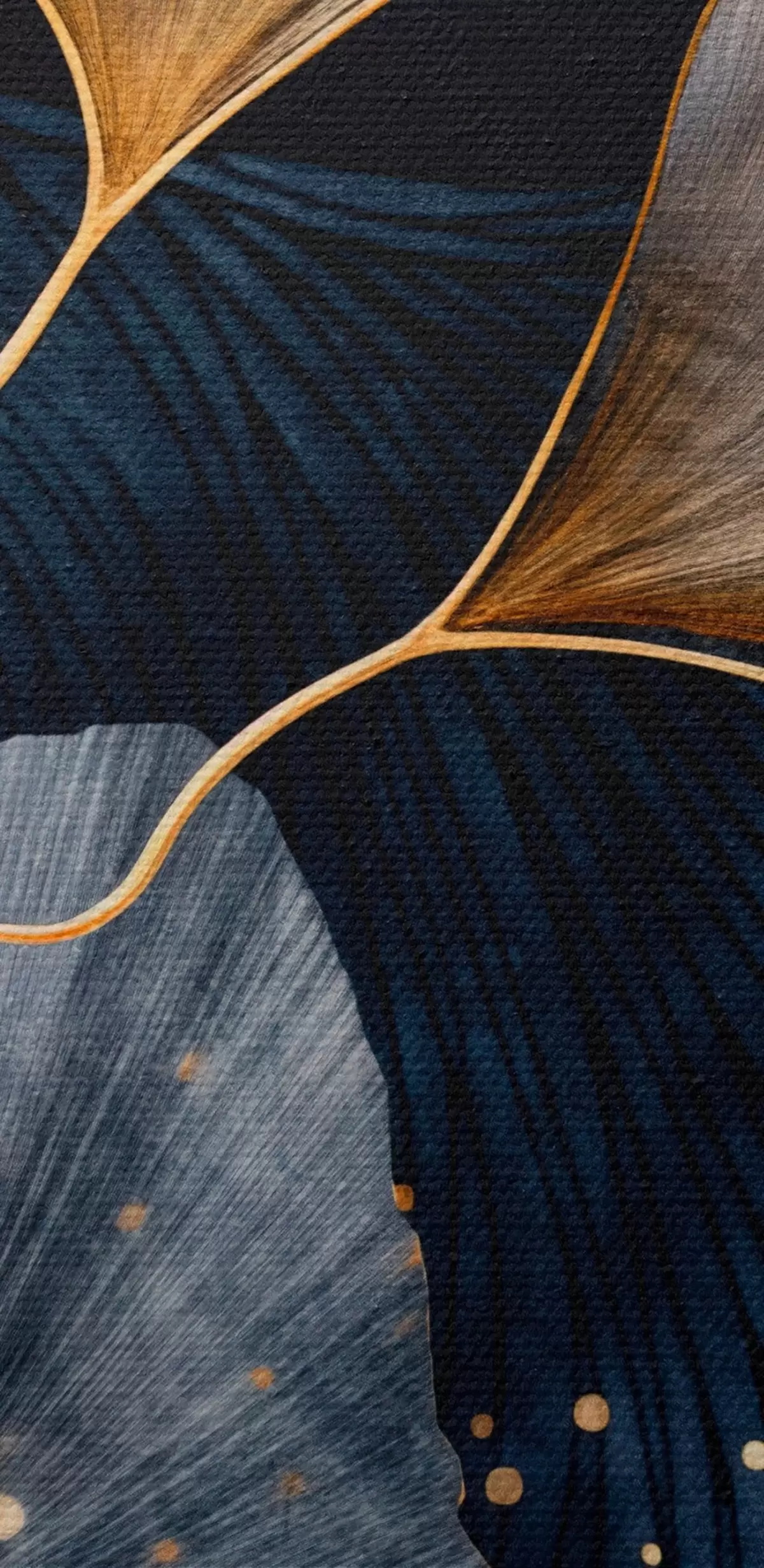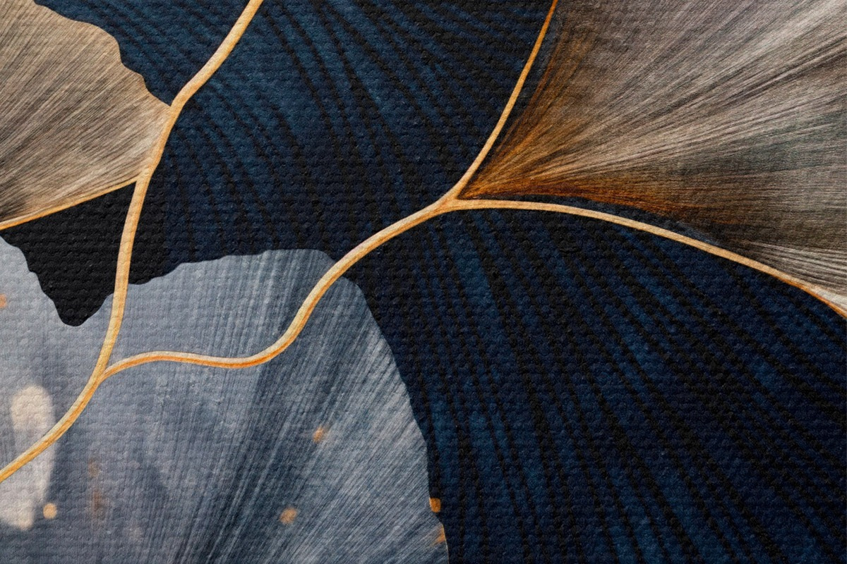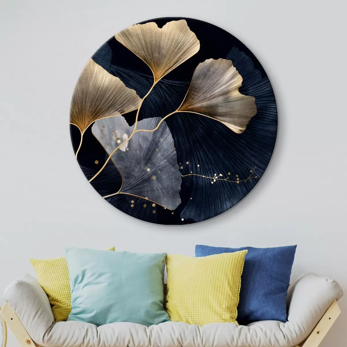 Tableaux rondes Feuilles de ginkgo dans les tons jaunes et bleus, élégant fond sombre, art moderne, style minimaliste, inspiré par la nature r44921