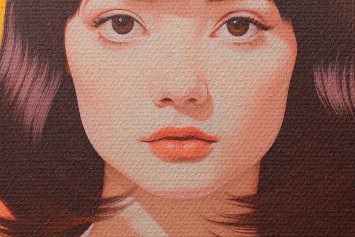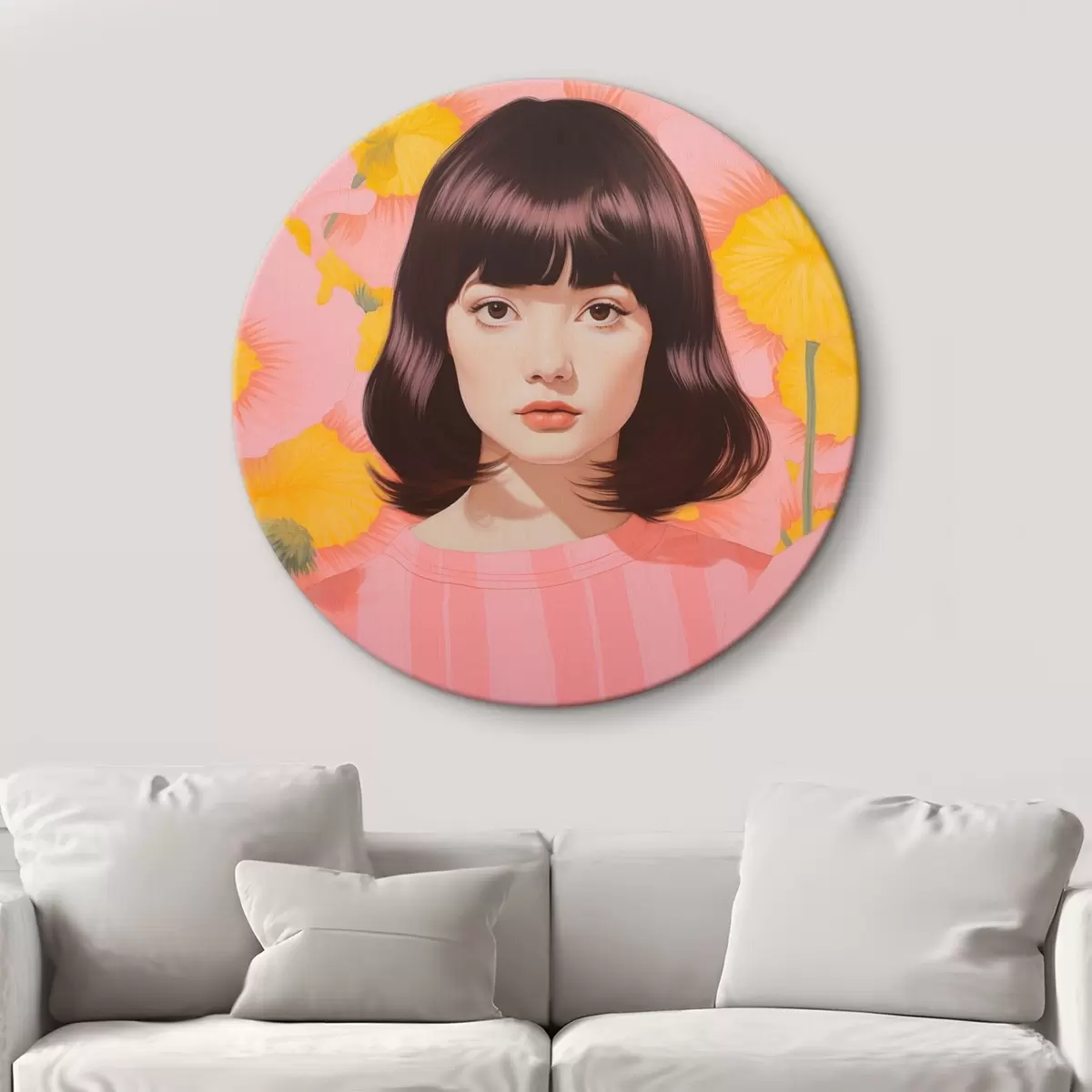 Tableaux rondes Portrait minimaliste décoratif d'une jeune fille asiatique dans un champ de fleurs jaunes et roses Nr r44924