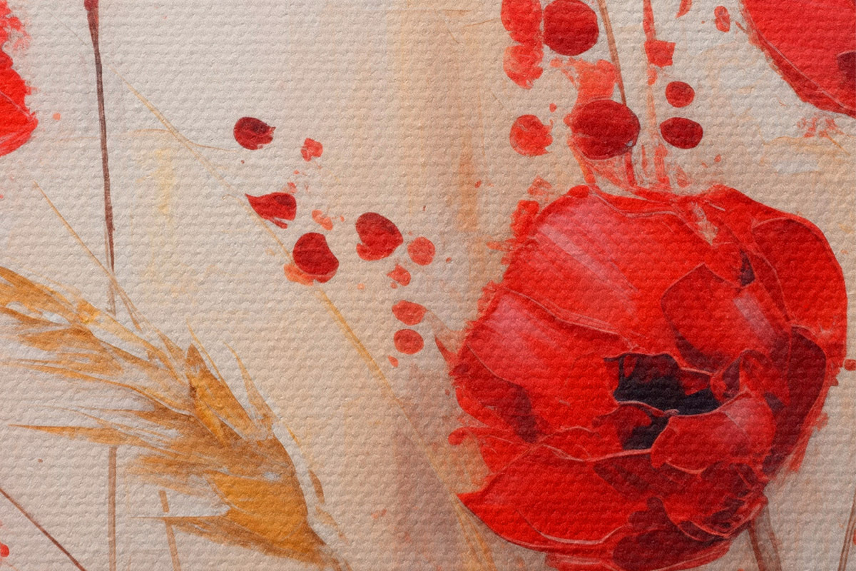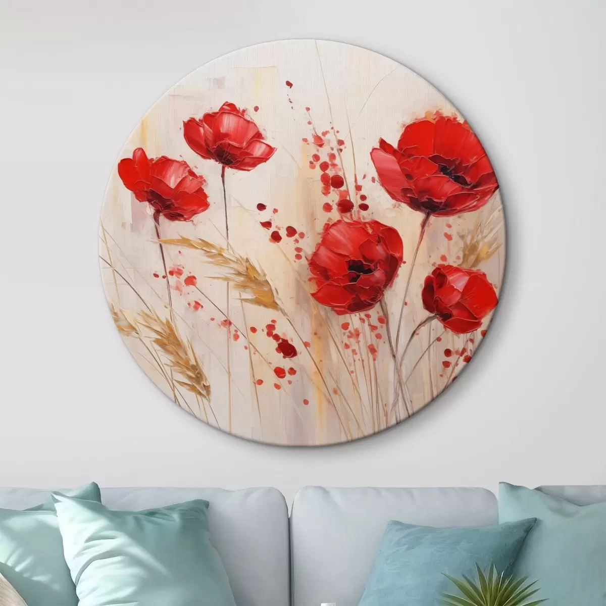 Tableaux rondes Fleurs de coquelicots rouges et tiges de blé jaunes, sur un fond doux et neutre avec des éclaboussures de peinture rouge r44926