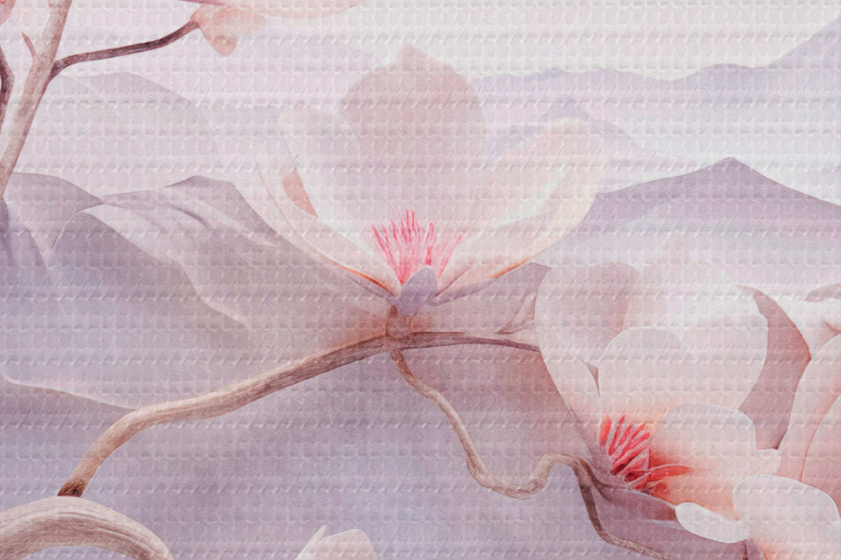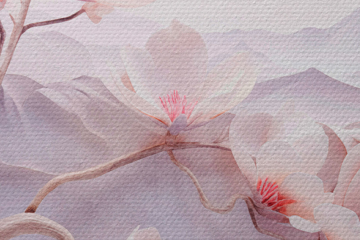 Tableaux rondes Branche fleurie avec des fleurs roses, montagnes en arrière-plan, couleurs pastel douces, art texturé japonais r44930