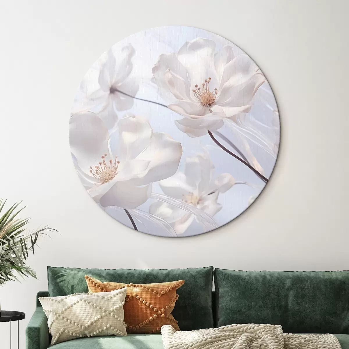 Tableaux rondes Fleurs blanches aux pétales translucides, fond bleu clair doux, élégant, romantique, délicat, rêveur Nr r44931
