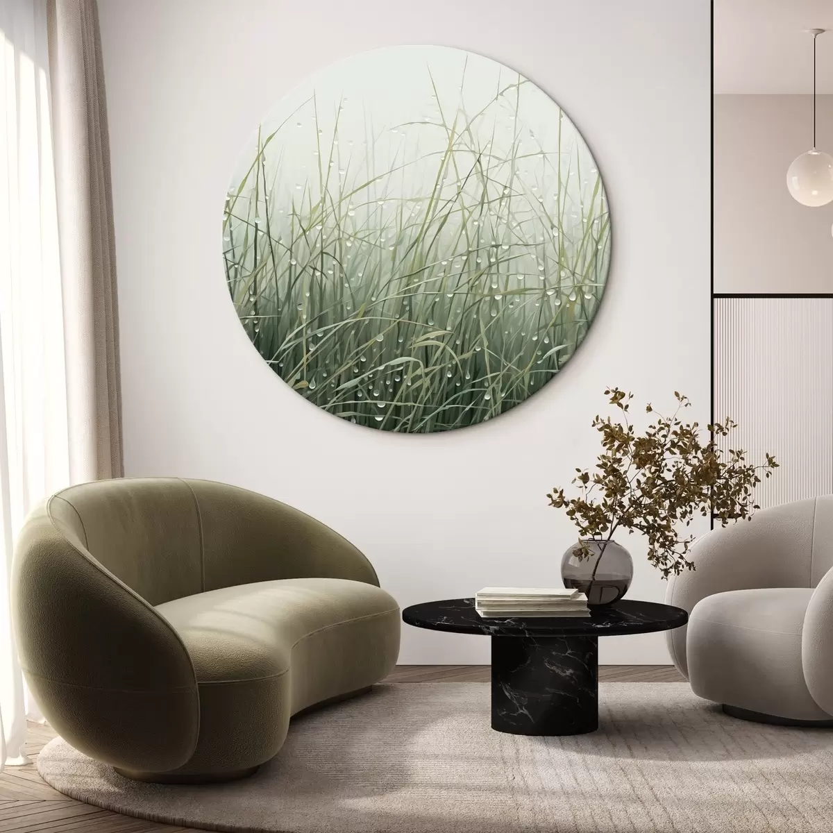 Tableaux rondes Herbe avec gouttes d'eau, nuances de vert, lumière douce, fond brumeux, style abstrait minimaliste texturé Nr r44932