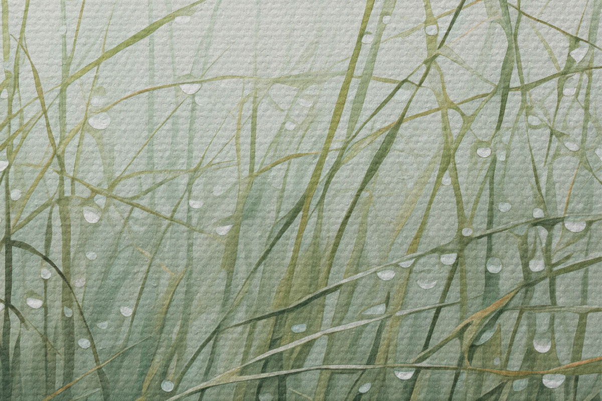 Tableaux rondes Herbe avec gouttes d'eau, nuances de vert, lumière douce, fond brumeux, style abstrait minimaliste texturé r44932