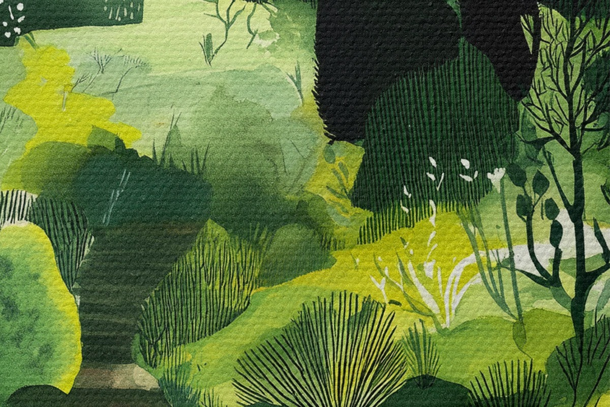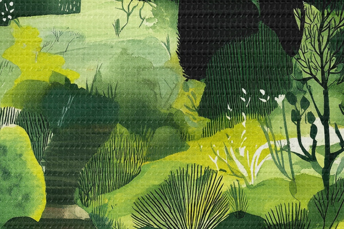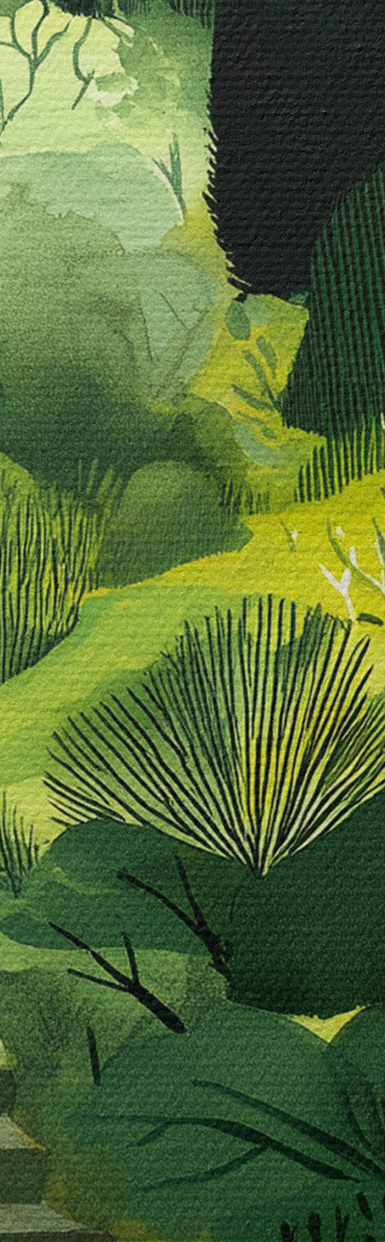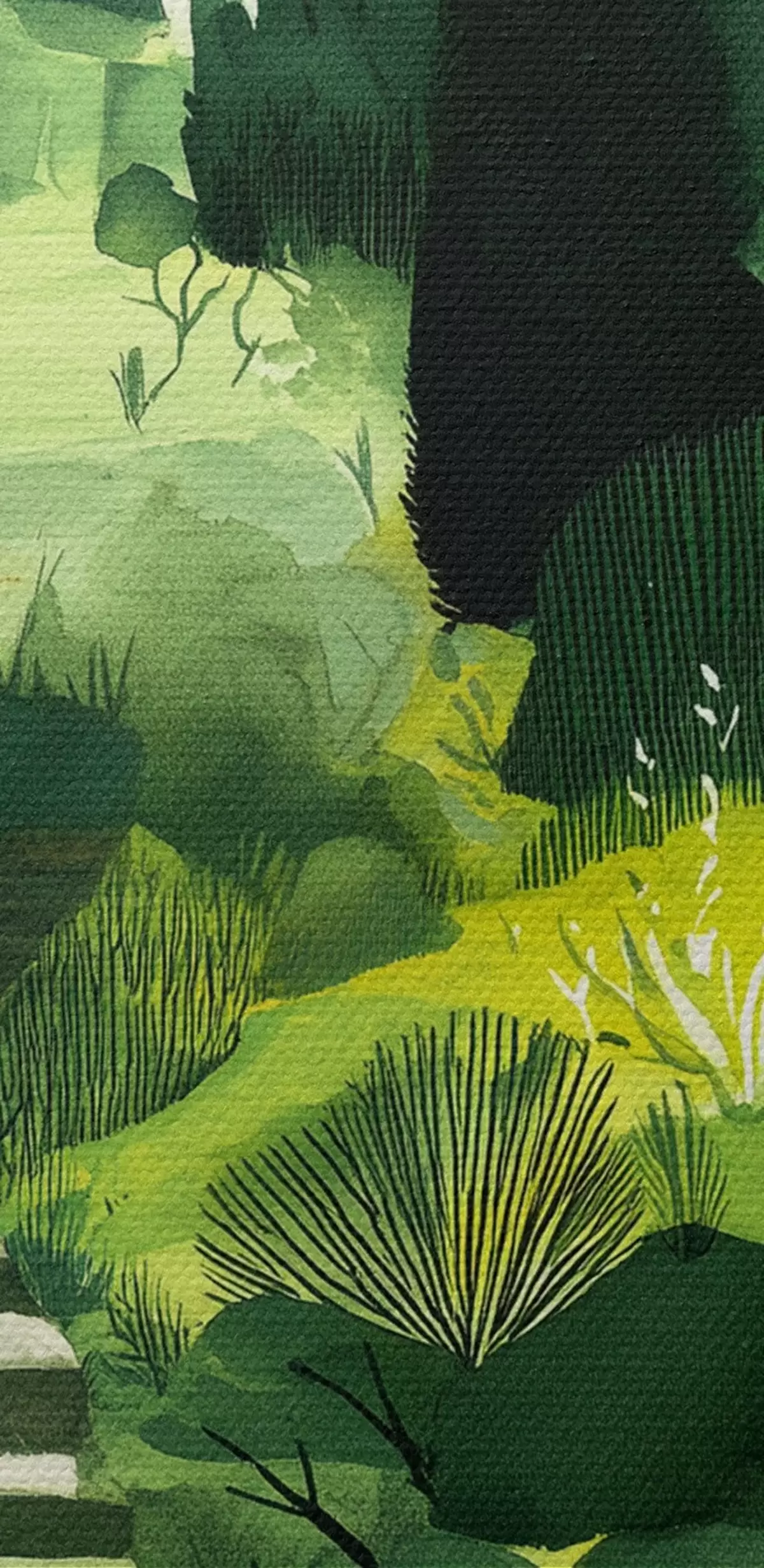 Tableaux rondes Collines vertes avec arbres et buissons, escaliers en béton, couleurs luxuriantes r44980