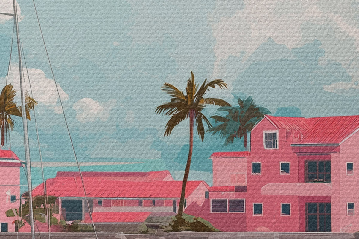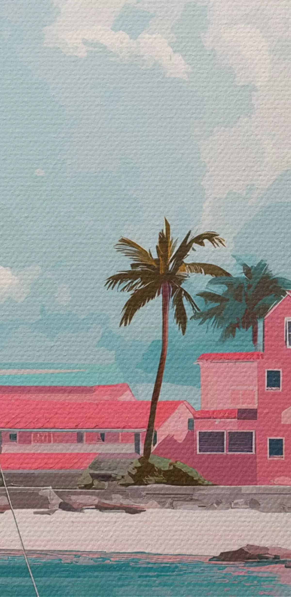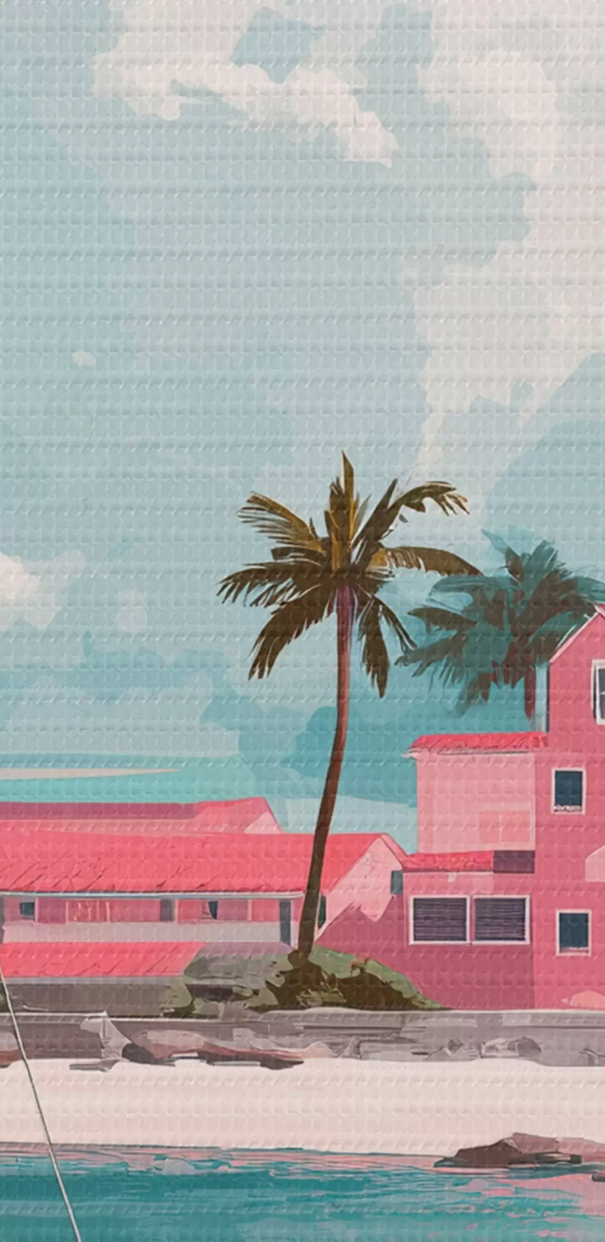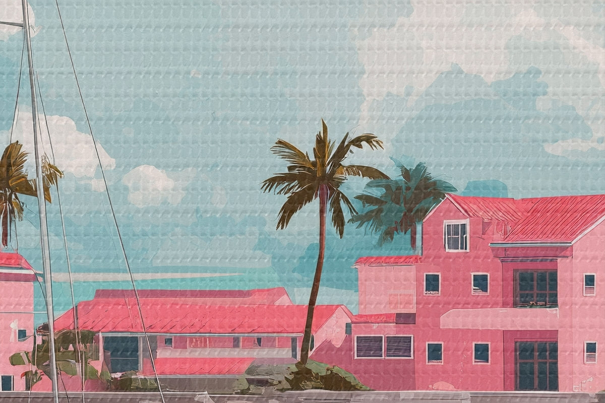 Tableaux rondes Plage rose avec soleil éclatant, voilier et maisons r44986