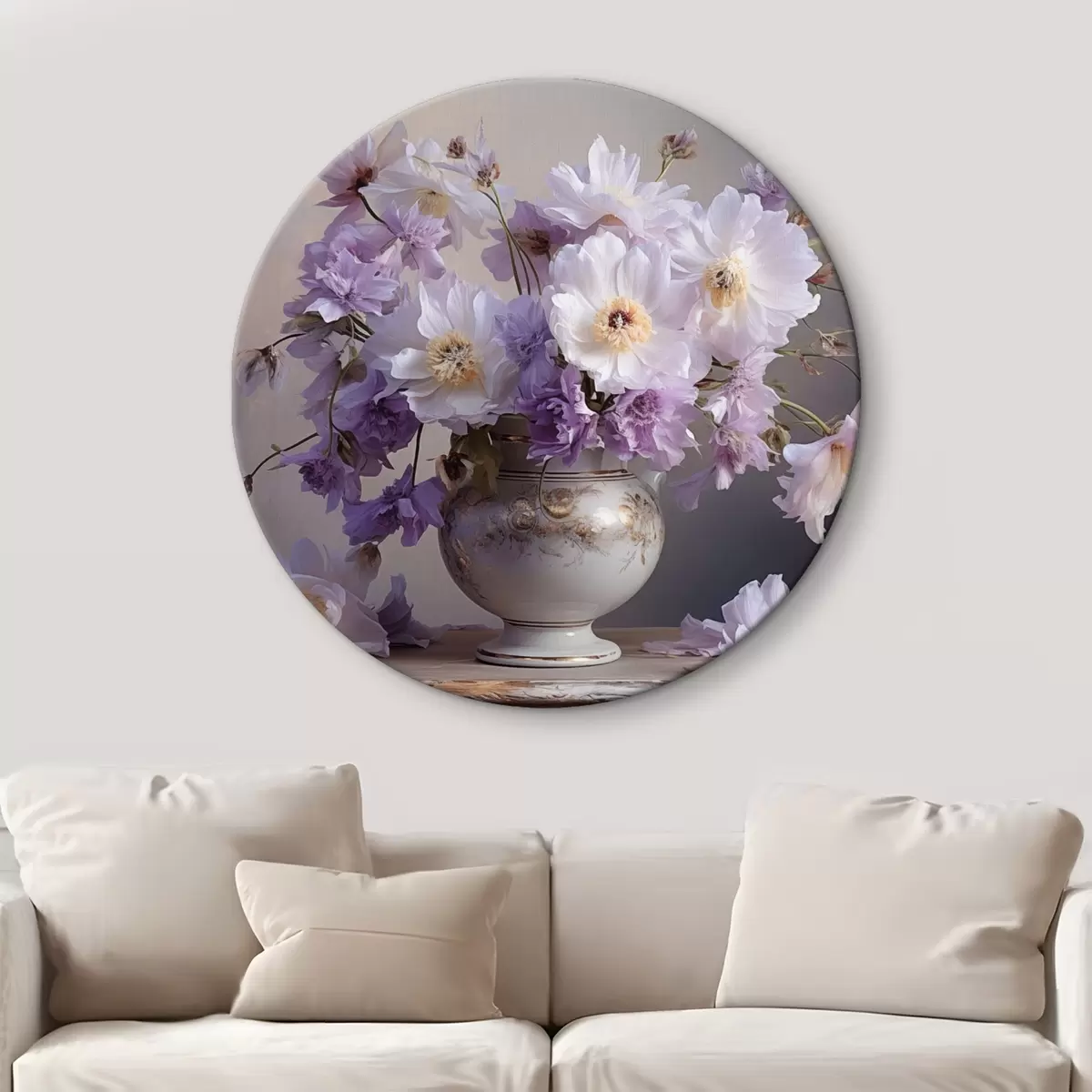 Tableaux rondes Nature morte florale : fleurs blanches et violettes dans un style artistique Nr r45058