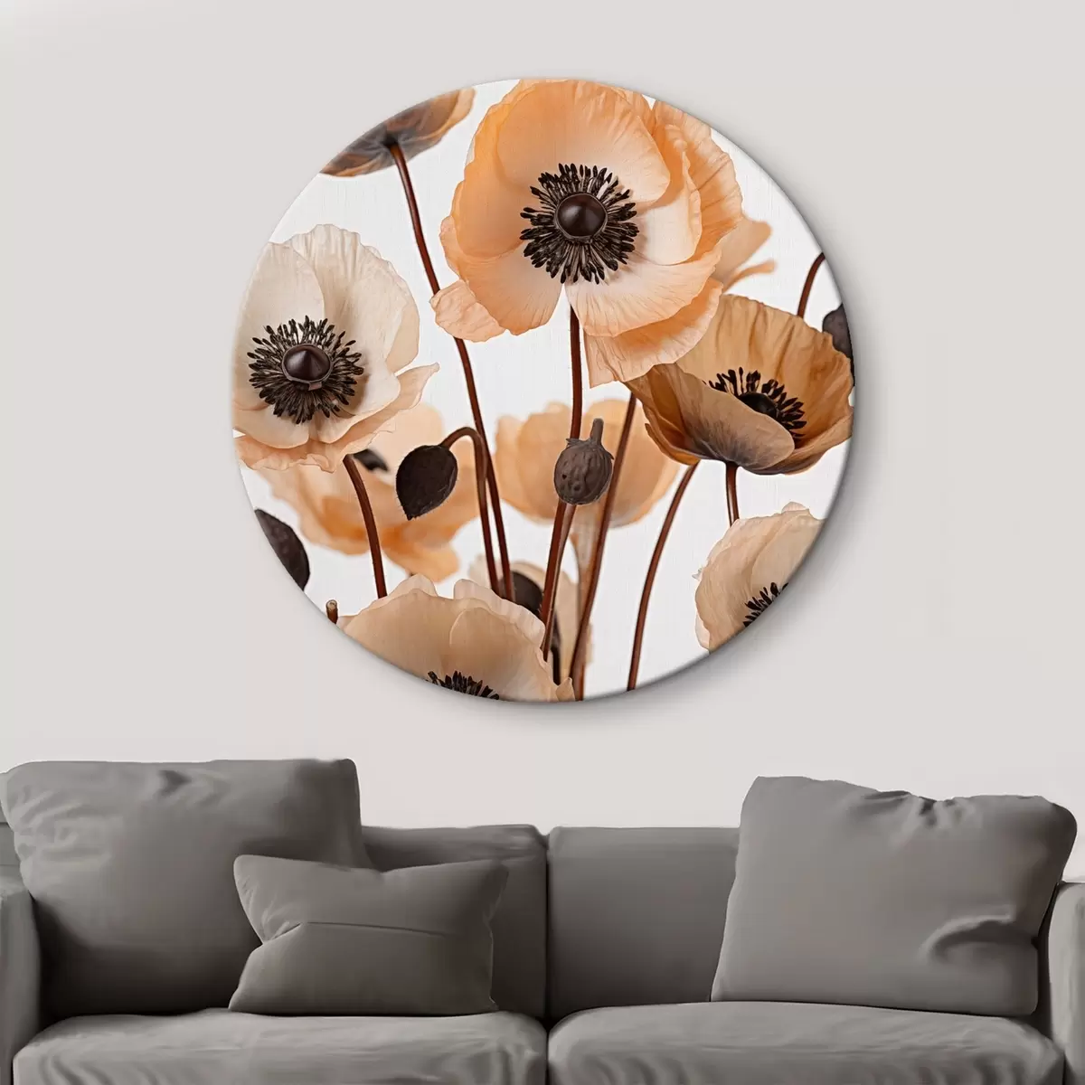 Tableaux rondes Coquelicots orange, fleurs séchées sur fond clair, éclairage doux, pétales délicats, arrangement floral Nr r45168