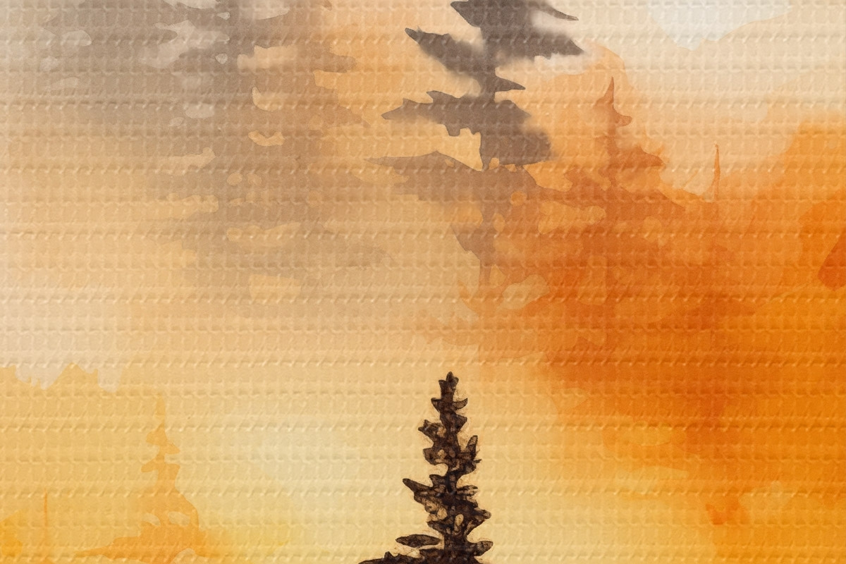 Tableaux rondes Peinture aquarelle d'un paysage imitant une forêt avec de grands pins et des montagnes en arrière-plan Nr r45170