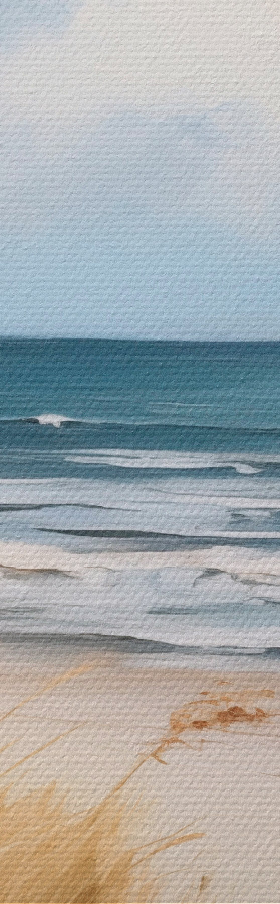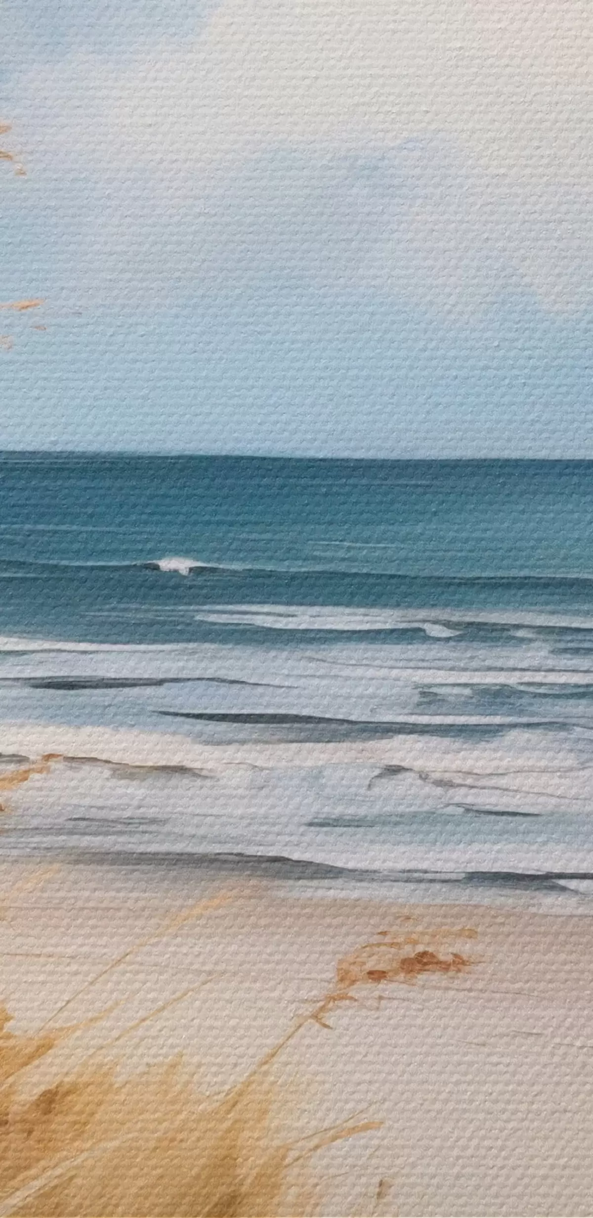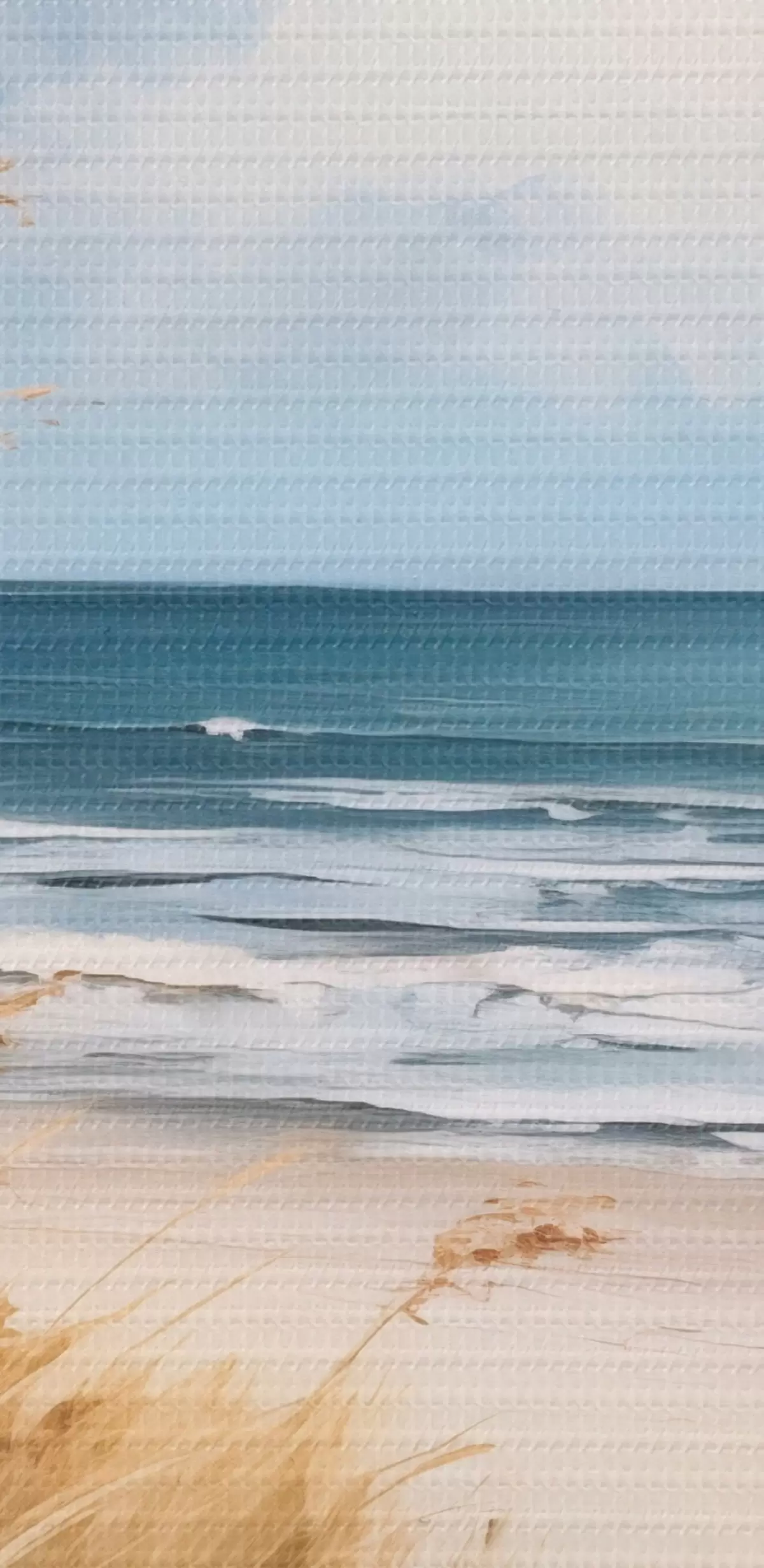 Tableaux rondes Une plage de sable avec des herbes hautes au premier plan, l'océan avec des vagues et un ciel nuageux à l'arrière-plan Nr r45174