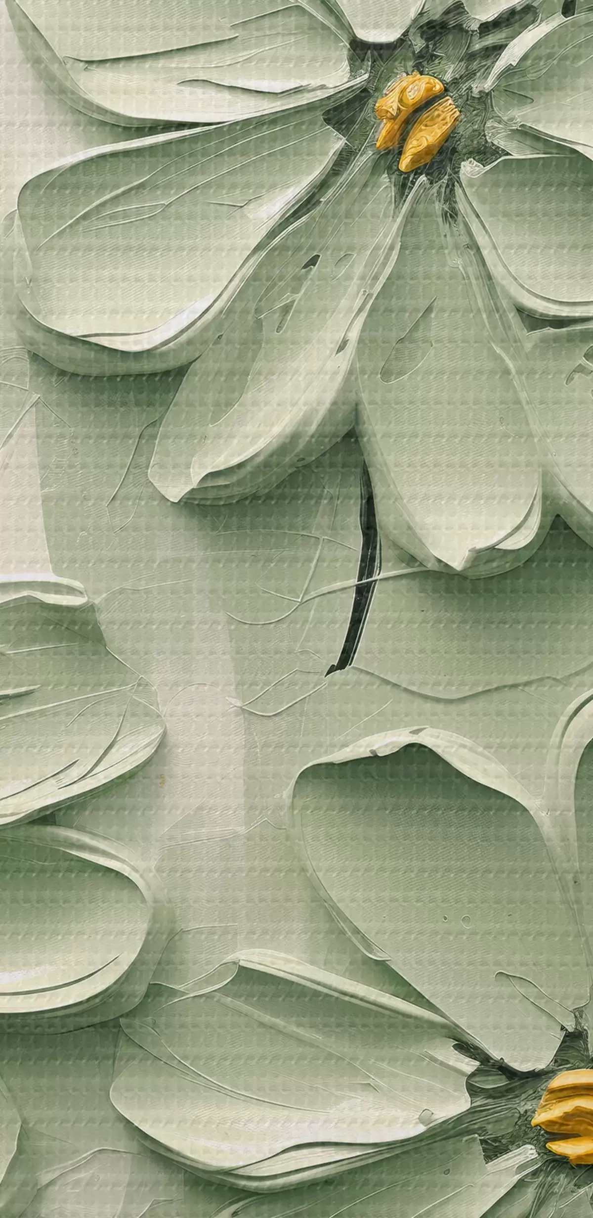 Tableaux rondes Fleurs vertes à centre jaune peintes à grands coups de pinceau sur fond clair Nr r45265