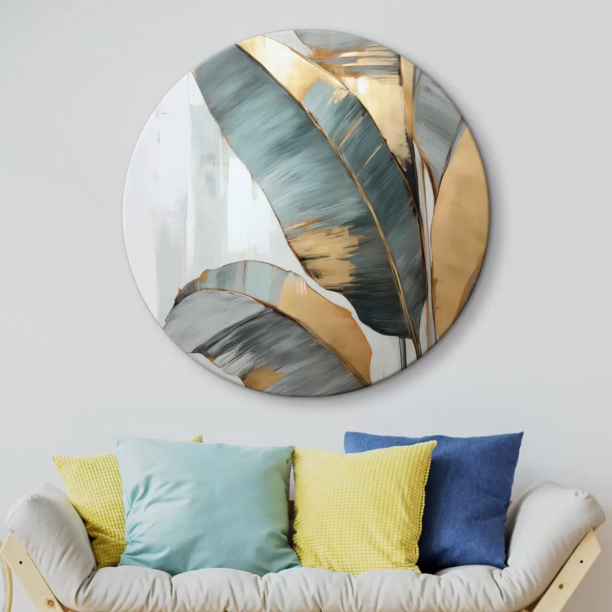 Tableaux rondes Un ensemble de feuilles de bananier bleues, grises et jaunes avec des coups de pinceau visibles, sur un fond blanc abstrait Nr r45551