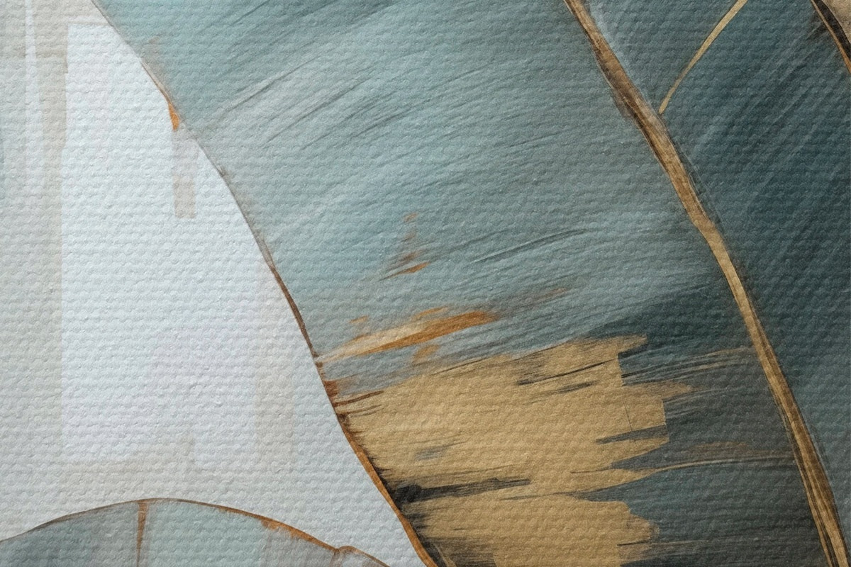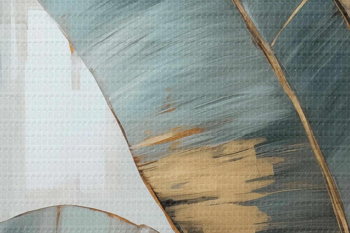 Tableaux rondes Un ensemble de feuilles de bananier bleues, grises et jaunes avec des coups de pinceau visibles, sur un fond blanc abstrait r45551