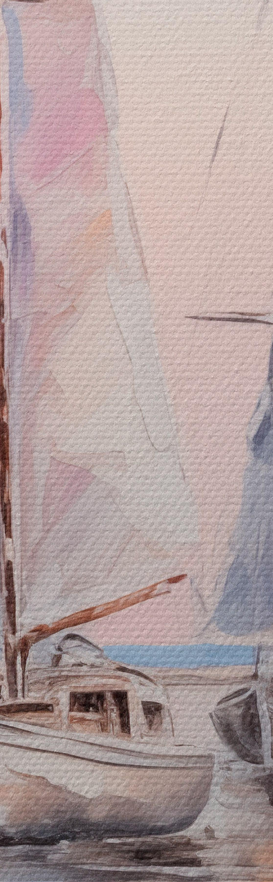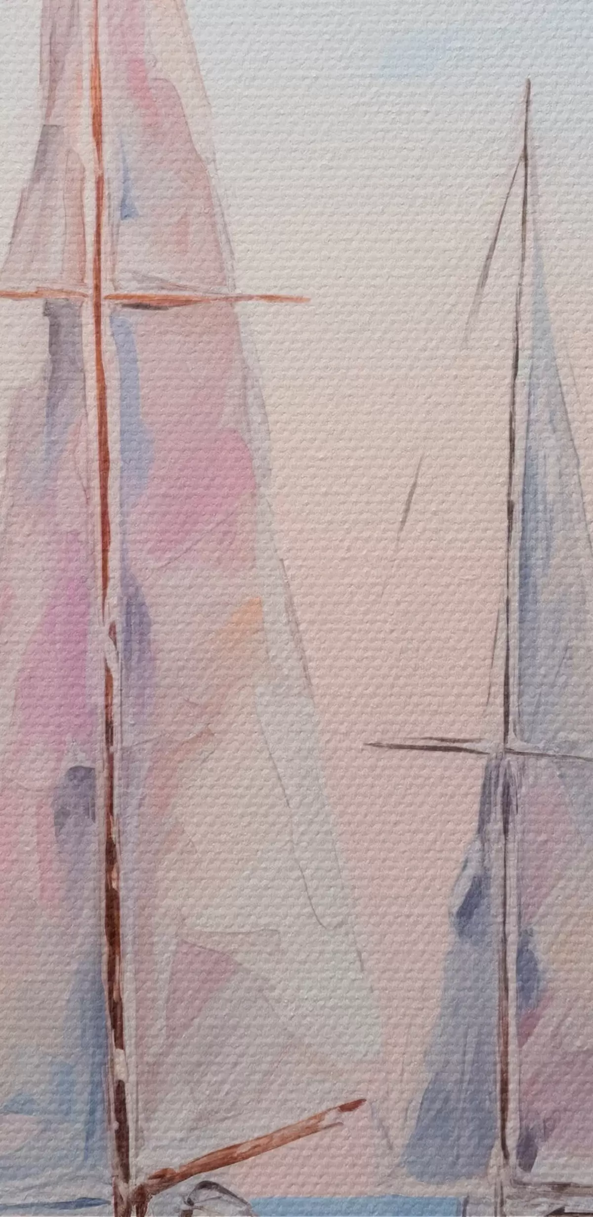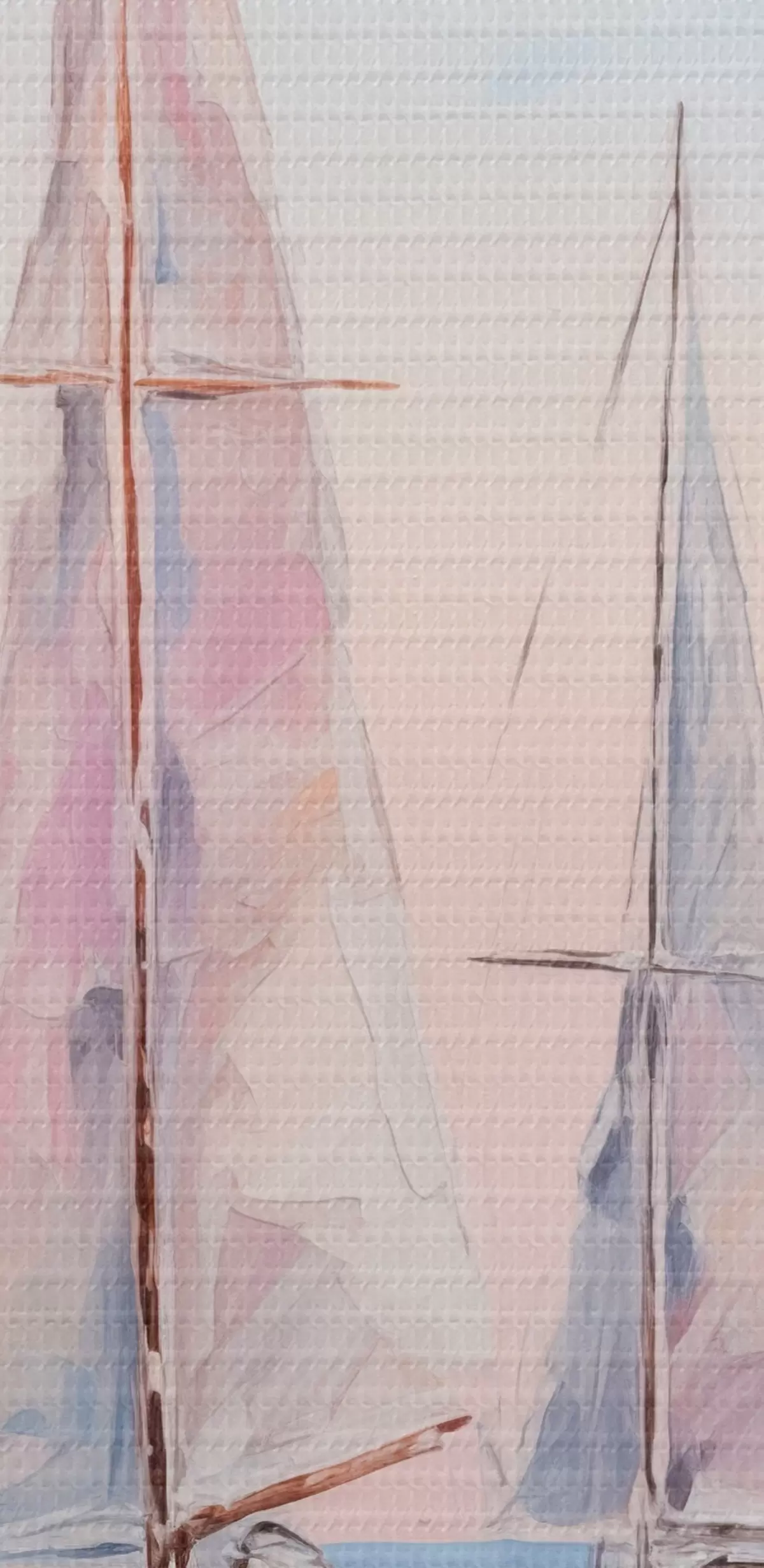 Tableaux rondes Voiliers aux voiles roses flottant sur une mer calme, reflets des bateaux dans l'eau, couleurs douces et pastel Nr r45558