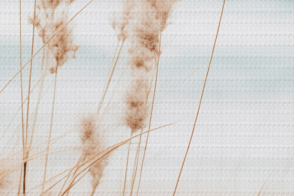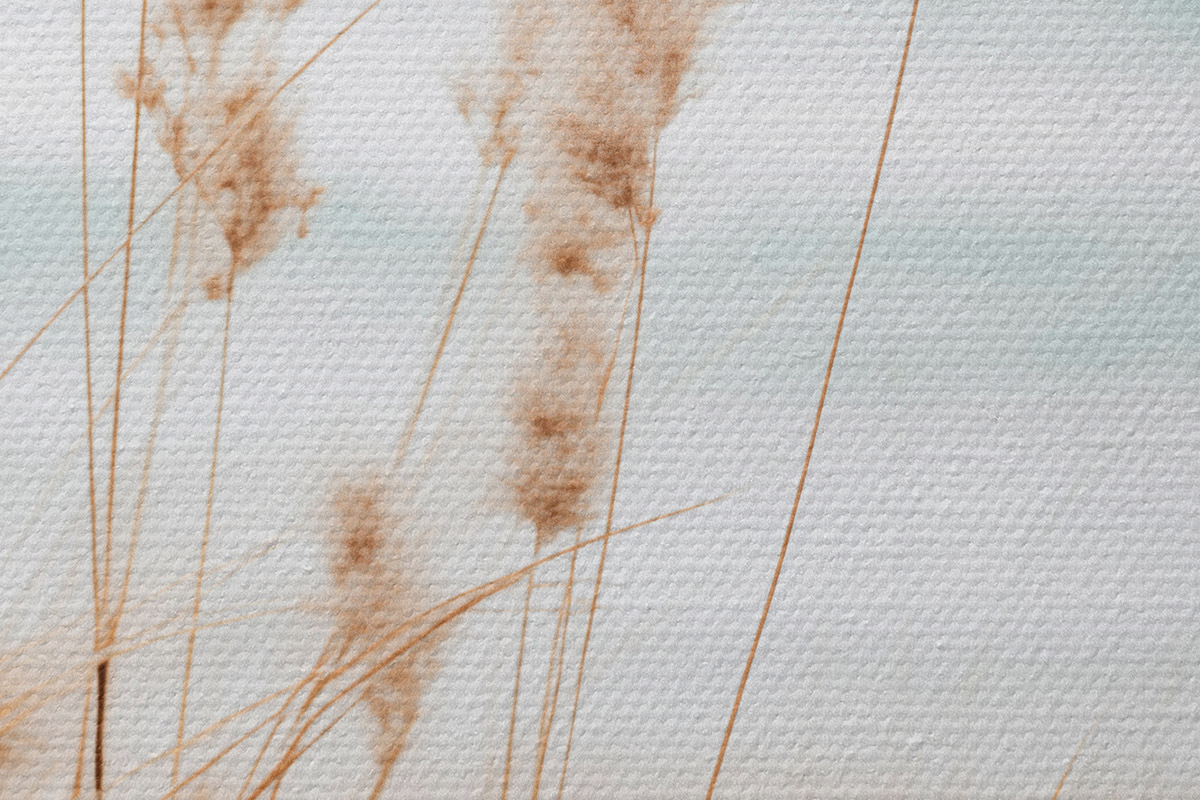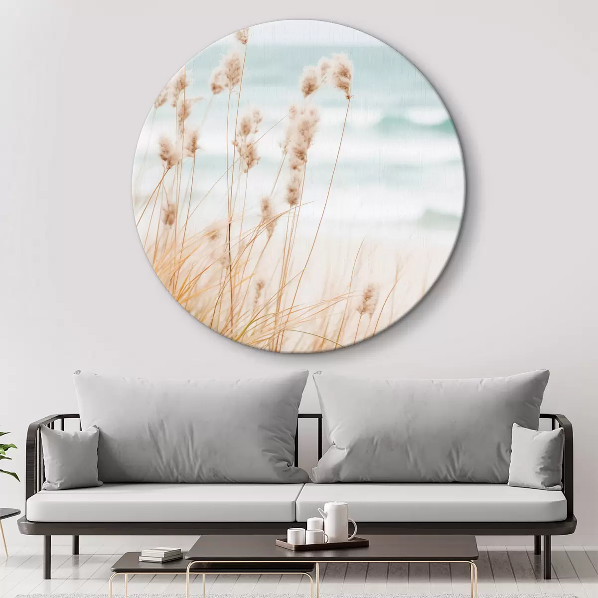 Tableaux rondes Herbe haute avec des têtes de graines duveteuses, plage de sable et vagues de l'océan en arrière-plan, palette de couleurs douces et sourdes Nr r45561