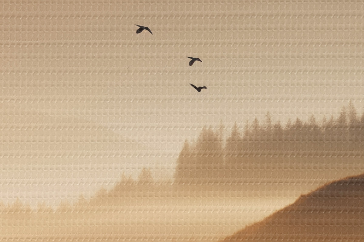 Tableaux rondes Un paysage de montagne avec une forêt et des oiseaux volant dans le ciel, le tout recouvert d'une épaisse couche de brouillard au lever du soleil r45563