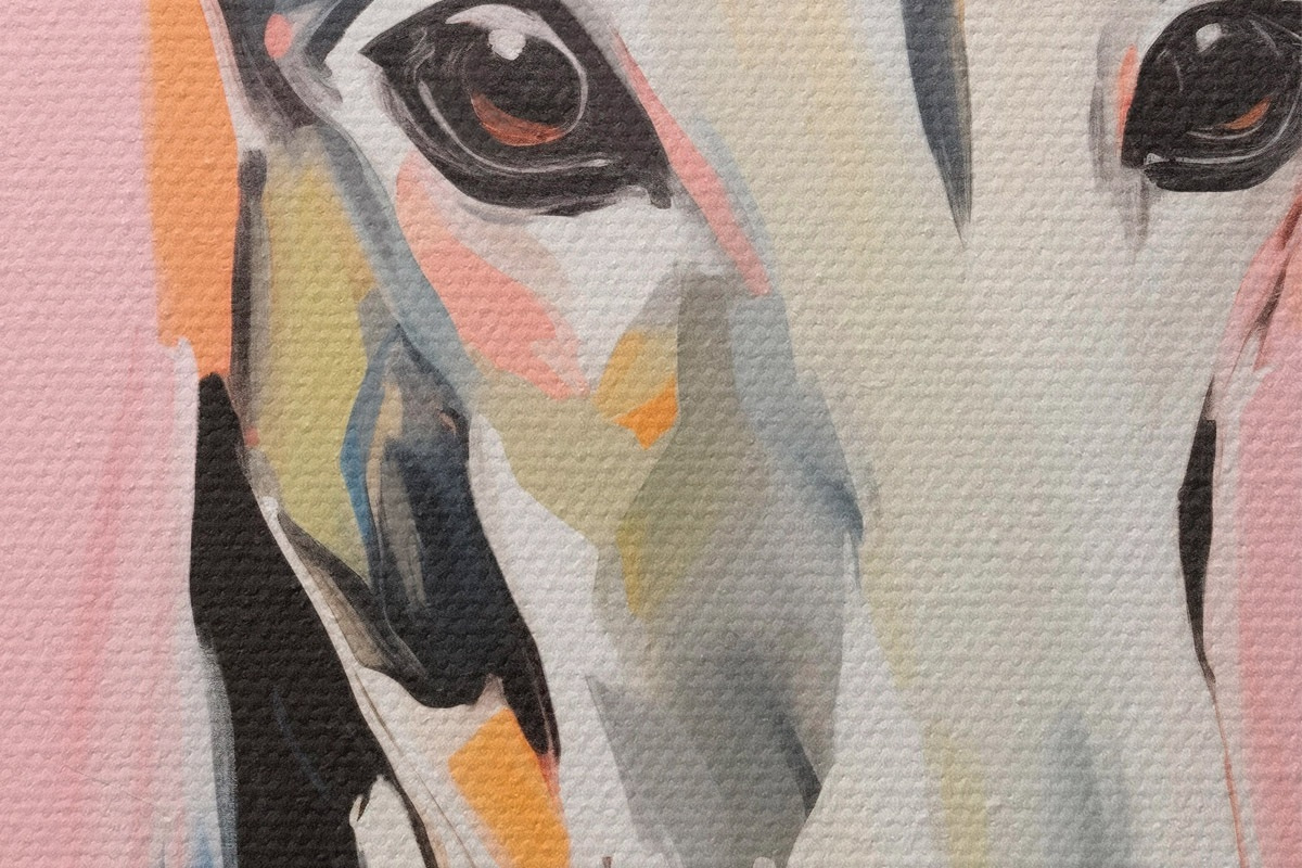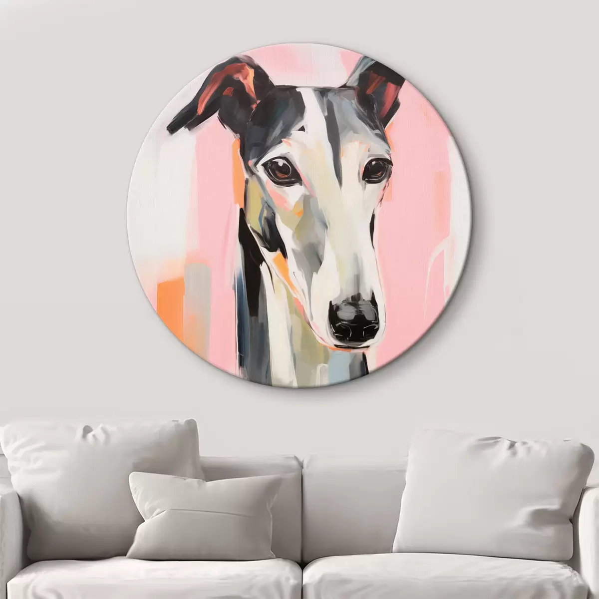 Tableaux rondes Un lévrier sur un fond de coups de pinceau roses, orange et blancs Nr r45566