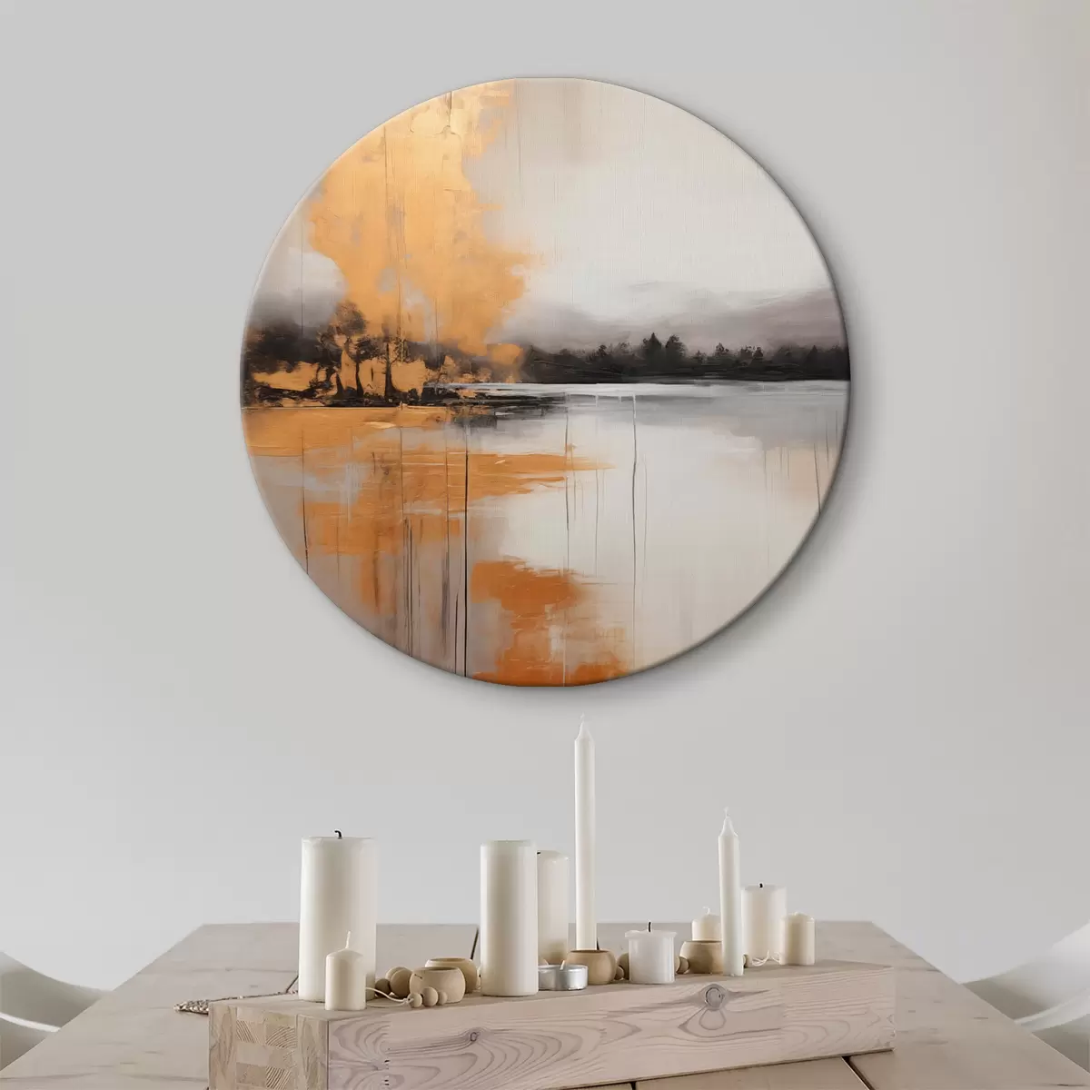 Tableaux rondes Un paysage abstrait avec un lac, un arbre et un brouillard jaune, l'eau se reflète et le ciel est nuageux Nr r45575