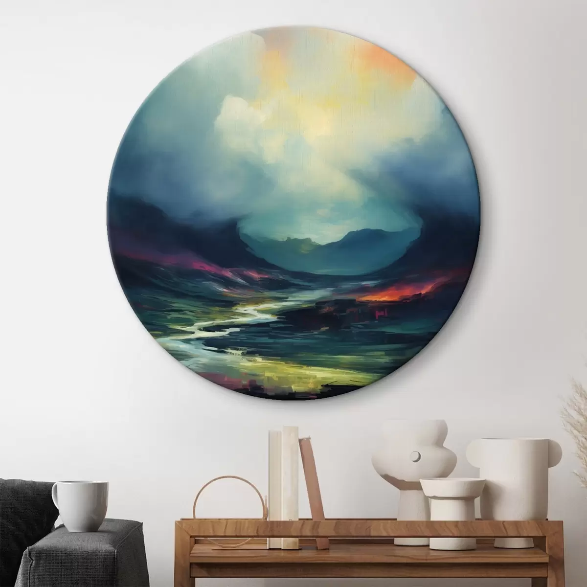 Tableaux rondes Paysage abstrait avec une rivière et des montagnes Nr r45627