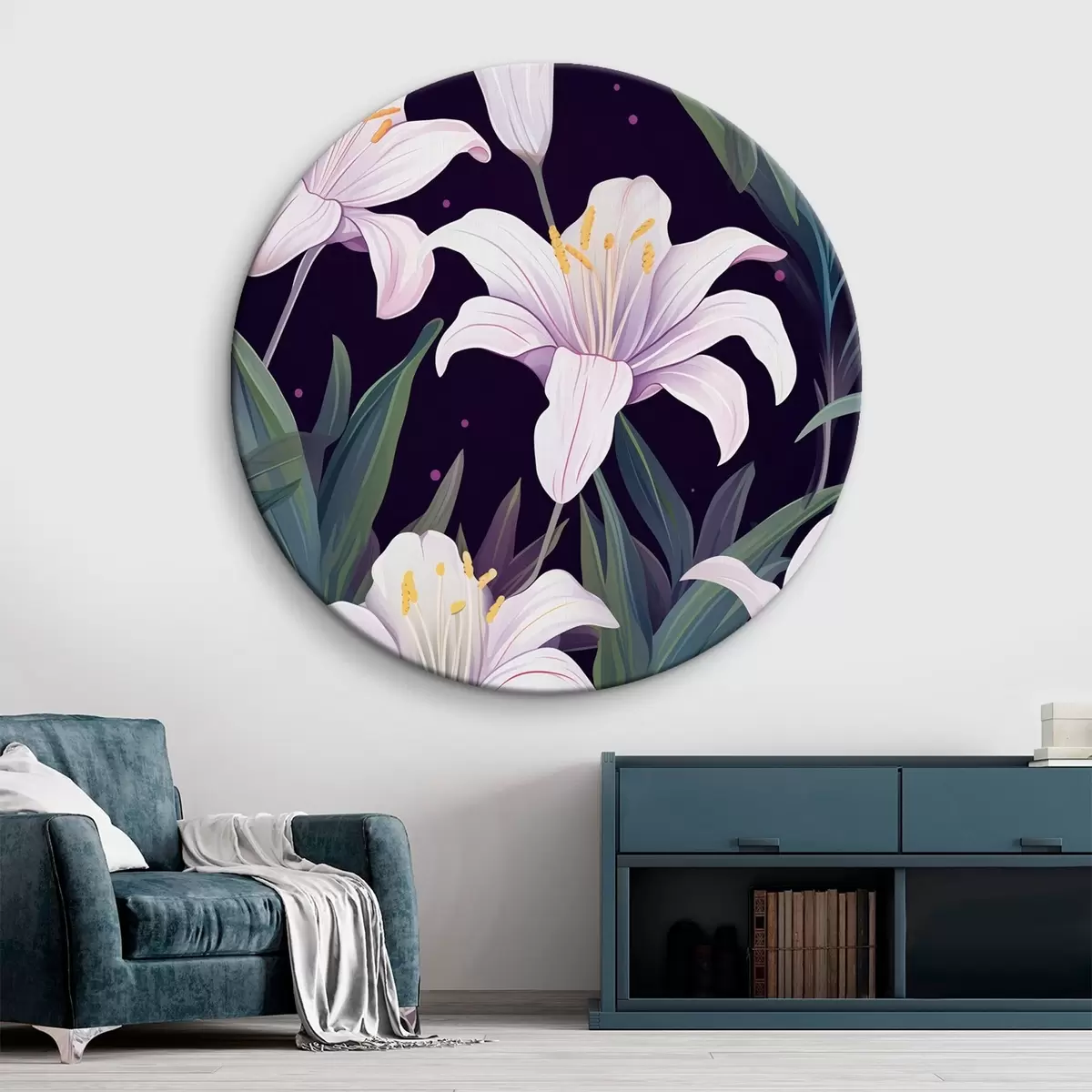 Tableaux rondes Lys délicats sur un fond sombre avec des feuilles vertes Nr r45697