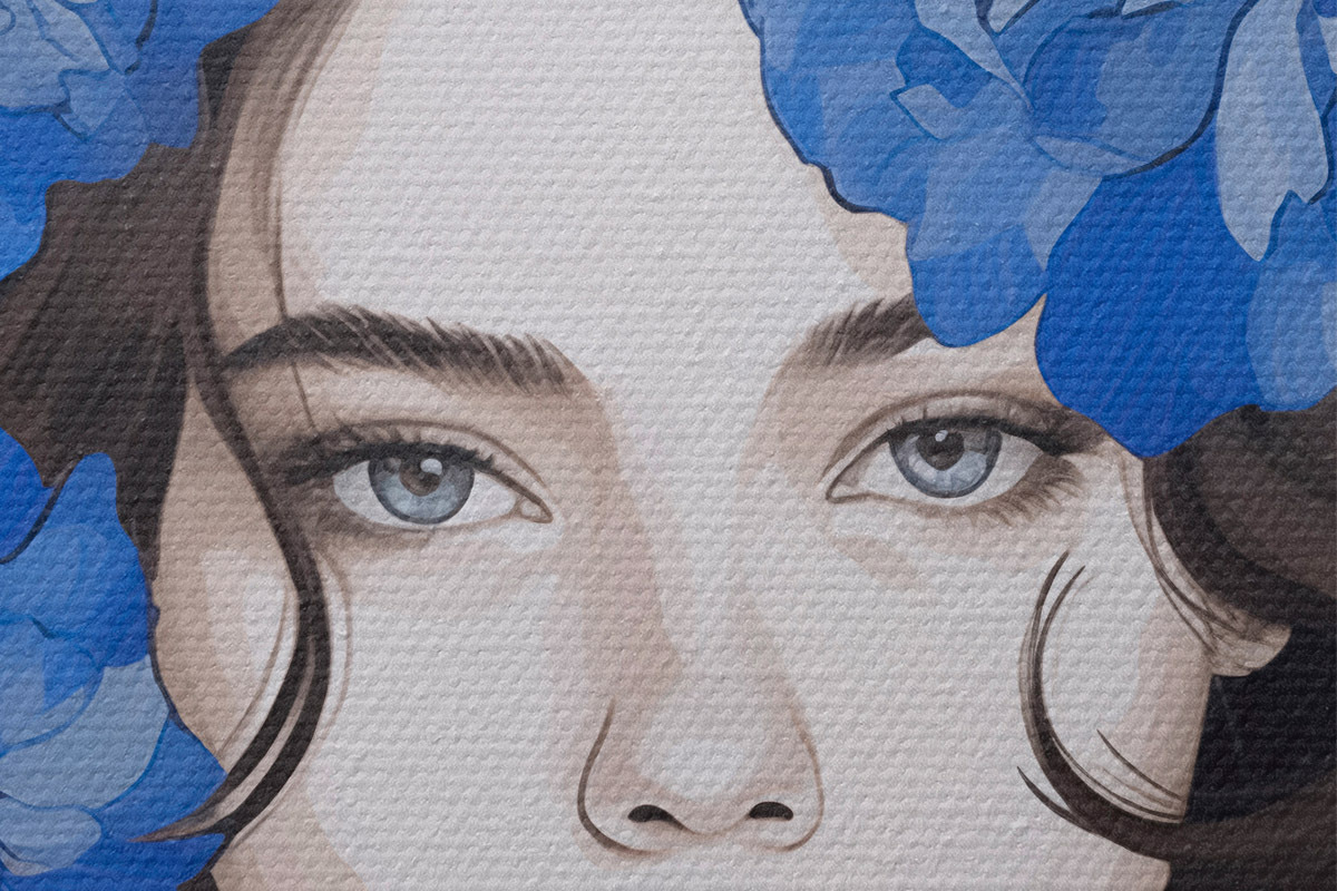 Tableaux rondes Portrait d'une jeune fille avec des fleurs bleues Nr r45756