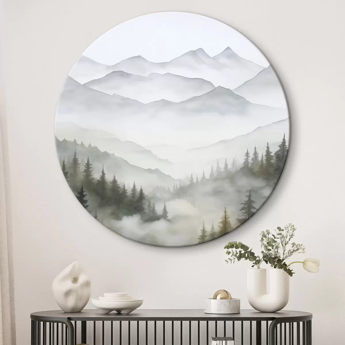 Tableaux rondes Forêt dans le brouillard devant les montagnes Nr r45774