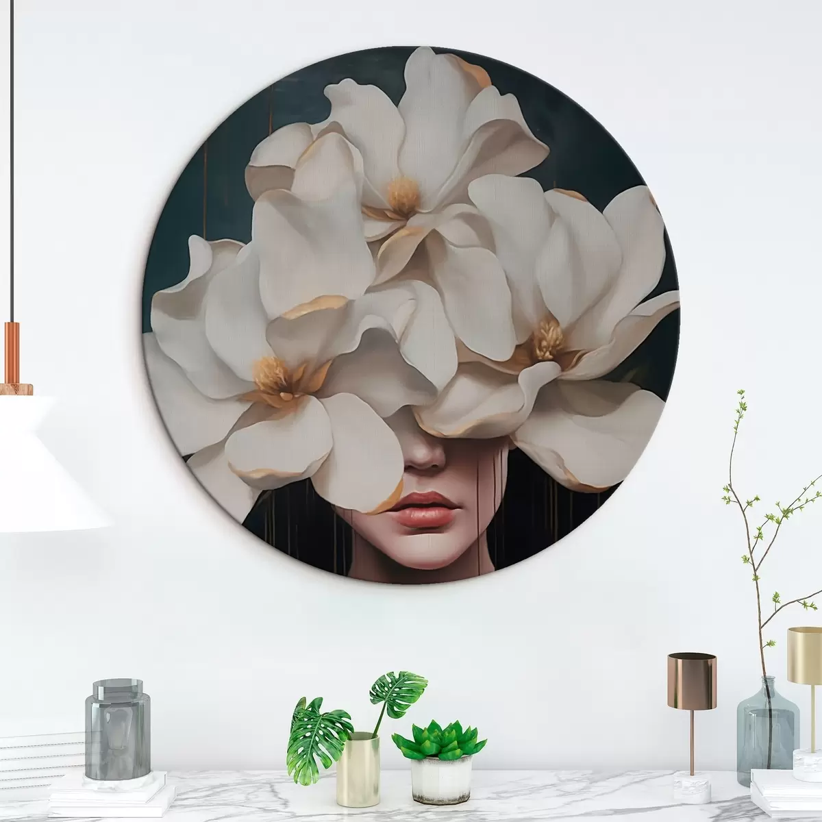 Tableaux rondes Femme avec des fleurs blanches sur la tête Nr r45843