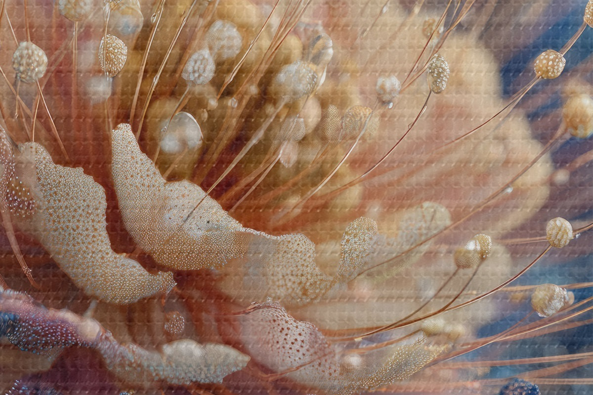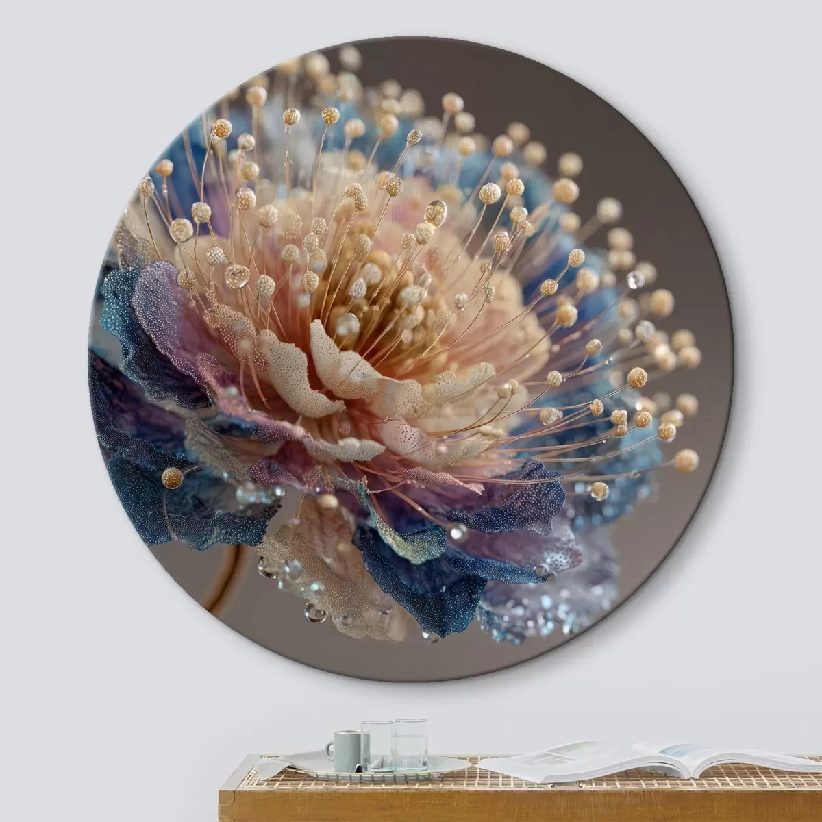 Tableaux rondes Fleur nacrée avec des gouttes de rosée, pétales couleur pêche et bleu Nr r45911