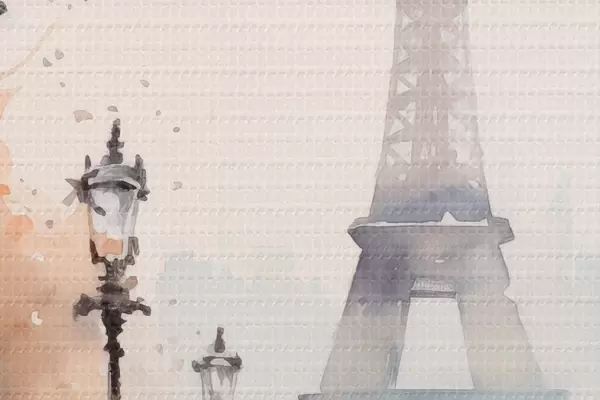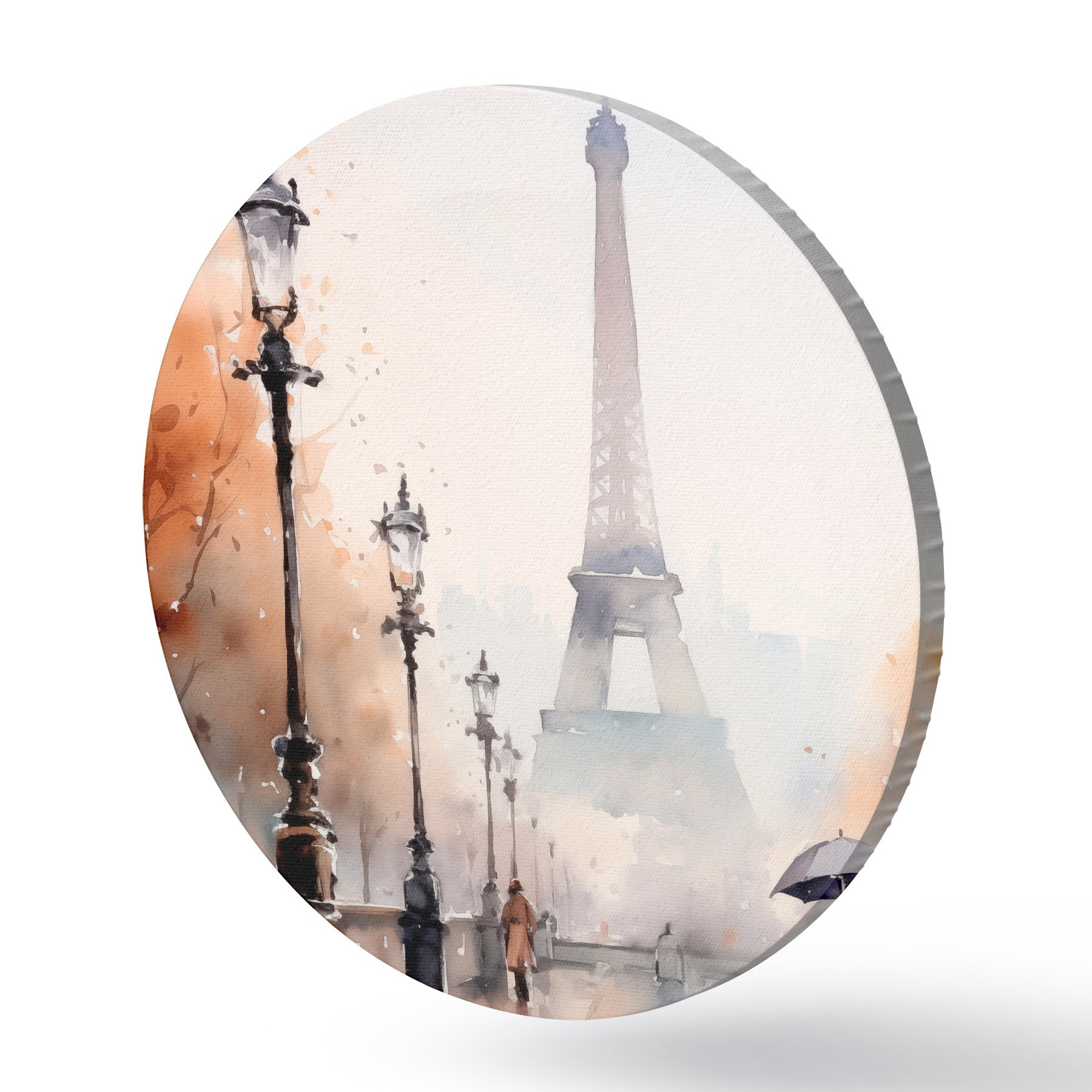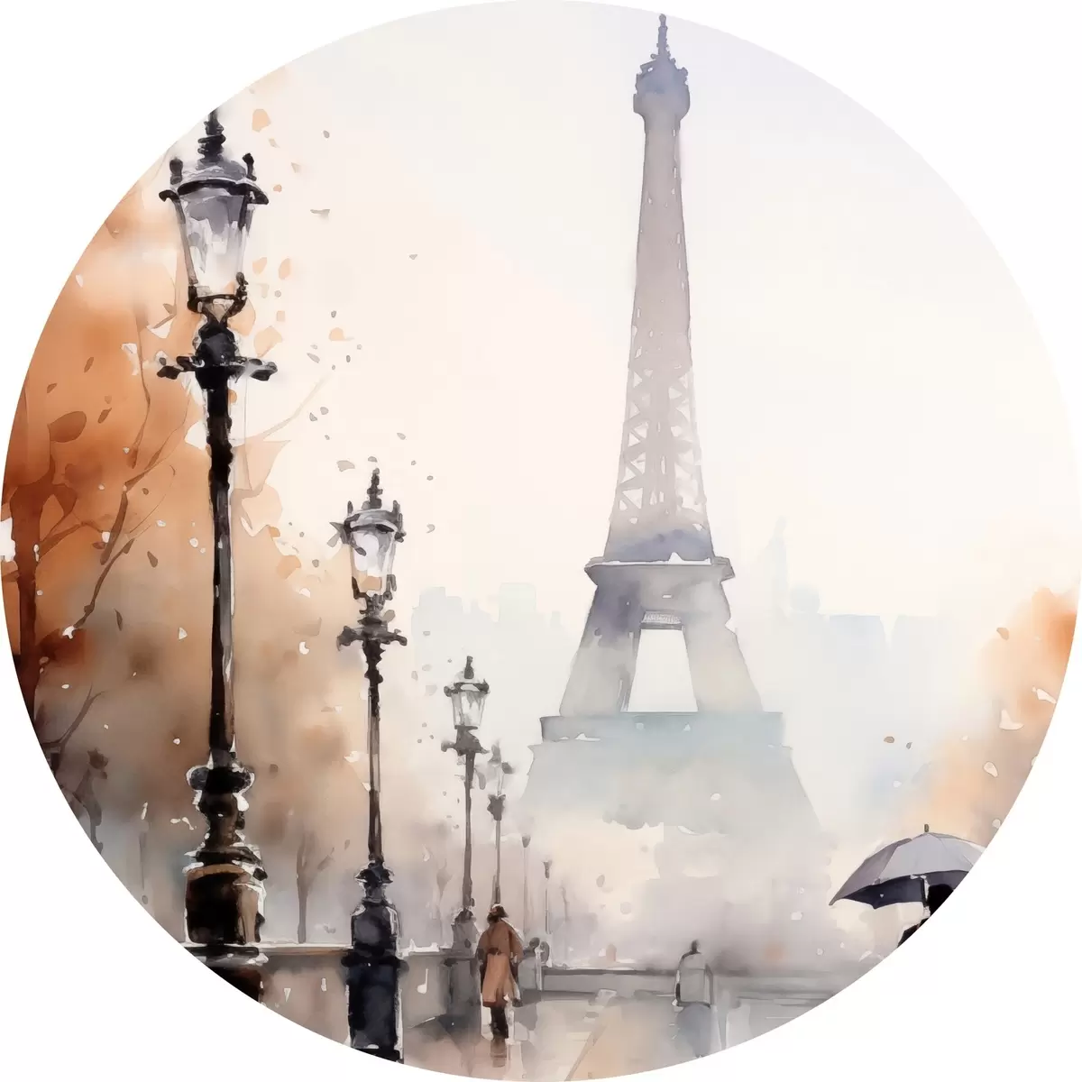 Tableaux rondes Une journée pluvieuse à Paris avec la tour Eiffel en arrière-plan et des lampadaires vintage r45930